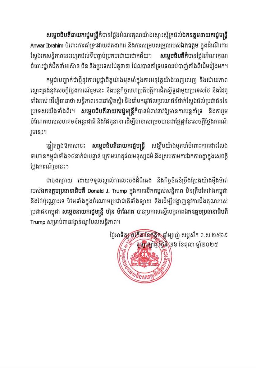 តាមរយៈសេចក្ដីប្រកាសដដែល តាងនាមប្រជាជនកម្ពុជាសម្តេចធិបតី ហ៊ុន ម៉ាណែត នាយករដ្ឋមន្រ្ដីកម្ពុជា បានថ្លែងអំណរគុណយ៉ាងជ្រាលជ្រៅបំផុតចំពោះឯកឧត្តមប្រធានាធិបតី Donald J. Trump ក្នុងភាពជាអ្នកដឹកនាំដ៏ម៉ឹងម៉ាត់ និងការប្តេជ្ញាចិត្តយ៉ាងខ្ជាប់ខ្ជួនក្នុងការគាំទ្រសន្តិភាពជានិរន្តន៍រវាងកម្ពុជានិងថៃ និងចំពោះកិច្ចខិតខំប្រឹងប្រែងដោយមិនគិតពីការនឿយហត់ក្នុងការជួយធ្វើឱ្យសមិទ្ធផលនេះក្លាយជាការពិត។