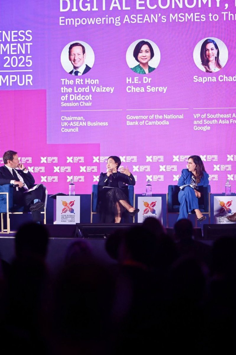 លោកជំទាវបណ្ឌិត ជា សិរី ទេសាភិបាលធនាគារជាតិនៃកម្ពុជា អញ្ជើញចូលរួមជាវាគ្មិន ក្នុងកិច្ចពិភាក្សានៃកិច្ចប្រជុំកំពូល ធុរកិច្ច និងវិនិយោគអាស៊ានឆ្នាំ២០២៥ (ABIS) ក្រោមប្រធានបទ “បង្កើនអំណាចដល់សហគ្រាសធុនមីក្រូ តូច និងមធ្យម (MSMEs) ក្នុងតំបន់អាស៊ាន ដើម្បីជំរុញការរីកចម្រើនក្នុងសេដ្ឋកិច្ចឌីជីថល” នាថ្ងៃទី២៦ ខែតុលា ឆ្នាំ២០២៥ នៅទីក្រុងគូឡាឡាំពួ ប្រទេសម៉ាឡេស៊ី។ វេទិកានេះមានការចូលរួមពីវាគ្មិនជំនាញ នៃថ្នាក់ដឹកនាំជាន់ខ្ពស់ មកពីក្រុមហ៊ុនបច្ចេកវិទ្យាធំៗលំដាប់ពិភពលោក ដូចជា Google និង TikTok ជាដើម ដោយកិច្ចពិភាក្សានេះបានផ្តោតលើដំណោះស្រាយចំពោះឧបសគ្គរបស់ MSMEs ក្នុងសេដ្ឋកិច្ច ឌីជីថល កិច្ចសហប្រតិបត្តិការតំបន់ និងតួនាទីរបស់ស្ថាប័នហិរញ្ញវត្ថុ និងបច្ចេកវិទ្យា ក្នុងការបង្កើនអំណាចដល់ MSMEs ក្នុងតំបន់ អាស៊ាន ដើម្បីជំរុញការរីកចម្រើនក្នុងសេដ្ឋកិច្ចឌីជីថល។