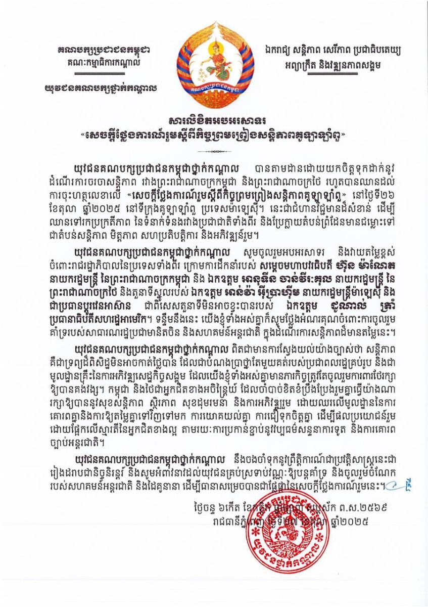 នេះគឺជាព្រឹត្តិការណ៍ដ៏មានសារៈសំខាន់យ៉ាងជ្រាលជ្រៅបំផុតរបស់ជាតិ ដែលជាការបញ្ជាក់ឡើងវិញនូវការប្តេជ្ញាចិត្តឥតងាករេរបស់កម្ពុជាក្នុងការដោះស្រាយជម្លោះដោយសន្តិវិធី ដូចមានចែងនៅក្នុងធម្មនុញ្ញអង្គការសហប្រជាជាតិ និងធម្មនុញ្ញអាស៊ាន។ «សូមគាំទ្រជាពិសេសចំពោះក្របខ័ណ្ឌដែលមានលក្ខណៈជាក់ស្ដែង និងគ្រប់ជ្រុងជ្រោយ ដូចមានចែងនៅក្នុងសេចក្ដីថ្លែងការណ៍នេះ។ វិធានការទាំងអស់នេះគឺជាការផ្តល់អាទិភាព ដល់សុវត្ថិភាព និងសន្តិសុខប្រជាជនកម្ពុជា និងការពារផលប្រយោជន៍ជាតិ តាមរយៈការដាក់ចេញនូវវិធានការបន្ធូរបន្ថយភាពតានតឹងជាបន្ទាន់ ការដោះស្រាយក្តីកង្វល់ផ្នែកមនុស្សធម៌សំខាន់ៗរួមទាំងការដោះលែងវីរយុទ្ធជនកម្ពុជាដែលកំពុងជាប់ឃុំ និងការបង្កើតជាផ្លូវការនូវយន្តការទ្វេភាគី និងតំបន់ដ៏រឹងមាំ តួយ៉ាងក្រុមអ្នកសង្កេតការណ៍អាស៊ាន (AOT) ដើម្បីធានាបាននូវស្ថិរភាពយូរអង្វែង និងការបន្តកិច្ចសន្ទនាលើបញ្ហាព្រំដែនដែលនៅសេសសល់។