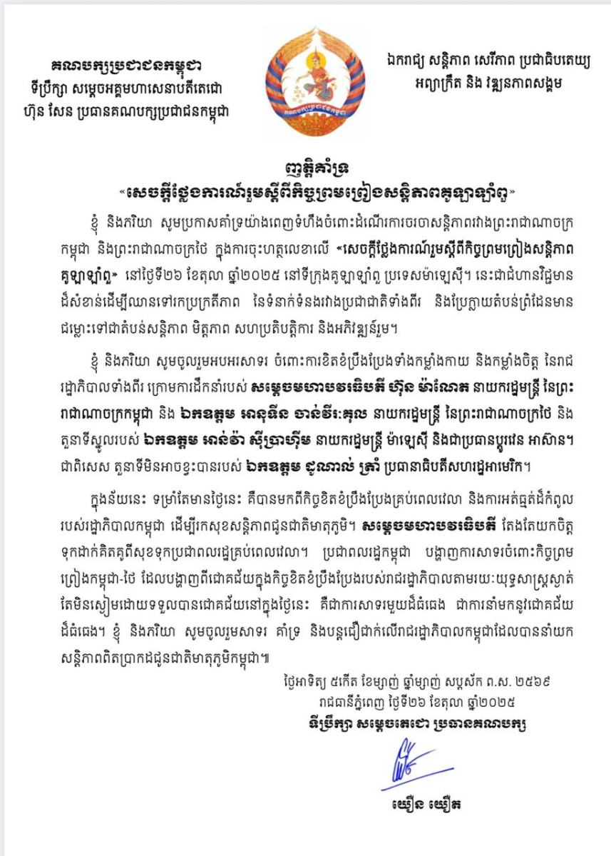 ព្រឹទ្ធសភា រដ្ឋសភា និងបណ្តាក្រសួង ស្ថាប័ននានានៅកម្ពុជា បានចេញញត្តិដាច់ដោយឡែកពីគ្នា ប្រកាសគំាទ្រយ៉ាងពេញទំហឹងនូវសេចក្តីថ្លែងការណ៍សន្តិភាពទីក្រុងកូឡាឡាំពួររវាងកម្ពុជា និងថៃ ខណៈសេចក្តីថ្លែងការណ៍នេះ ជាការបើកទំព័រថ្មីមួយជាសារវន្តនៅក្នុងការស្វែងរកសន្តិភាព និងបន្តកិច្ចសហប្រតិបត្តិការ បន្ទាប់ពីមានអរិភាពនៅតំបន់ព្រំដែននាពេលថ្មីៗនេះ។