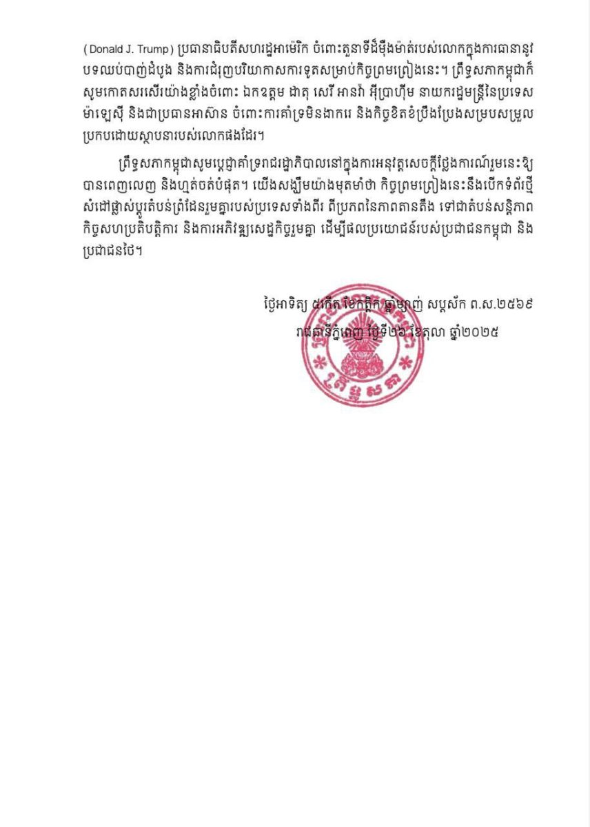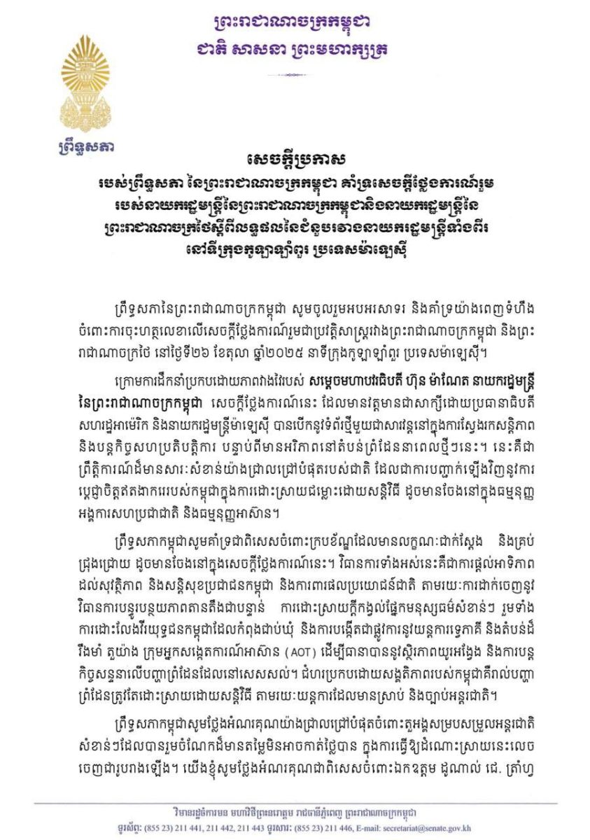 ញត្តិរបស់ព្រឹទ្ធសភា រដ្ឋសភា និងតាមបណ្តាក្រសួងស្ថាប័នទាំងនោះ បានលើក ឡើងដូចៗគ្នាថា សូមគាំទ្រសេចក្ដីថ្លែងការណ៍រួម របស់នាយករដ្ឋមន្ត្រីនៃព្រះរាជាណាចក្រកម្ពុជា និងនាយករដ្ឋមន្ត្រីព្រះរាជាណាចក្រថៃ ស្តីពីលទ្ធផលនៃជំនួបរវាងនាយករដ្ឋមន្ត្រីទាំងពីរ នៅទីក្រុងកូឡាឡាំពួរ ប្រទេសម៉ាឡេស៊ី ហើយក៏សូមចូលរួមអបអរសាទរ និងគាំទ្រយ៉ាងពេញទំហឹង ចំពោះការចុះហត្ថលេខាលើសេចក្ដីថ្លែងការណ៍រួមជាប្រវត្តិសាស្ត្ររវាងព្រះរាជាណាចក្រកម្ពុជា និងព្រះរាជាណាចក្រថៃ នៅថ្ងៃទី២៦ ខែតុលា ឆ្នាំ២០២៥ នាទីក្រុងកូឡាឡាំពួរ ប្រទេសម៉ាឡេស៊ីនេះ។