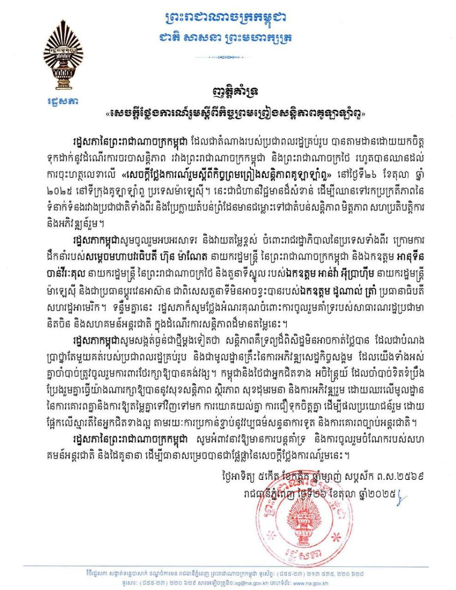 តាមរយៈញត្តិទាំងនោះ បានលើកឡើងទៀតថា ក្រោមការដឹកនាំប្រកបដោយភាពវាងវៃរបស់ សម្តេចមហាបវរធិបតី ហ៊ុន ម៉ាណែត នាយករដ្ឋមន្តី នៃព្រះរាជាណាចក្រកម្ពុជា សេចក្តីថ្លែងការណ៍នេះ ដែលមានវត្តមានជាសាក្សីដោយប្រធានាធិបតី សហរដ្ឋអាម៉េរិក និងនាយករដ្ឋមន្ត្រីម៉ាឡេស៊ី បានបើកនូវទំព័រថ្មីមួយជាសារវន្តនៅក្នុងការស្វែងរកសន្តិភាព និងបន្តកិច្ចសហប្រតិបត្តិការបន្ទាប់ពីមានអរិភាពនៅតំបន់ព្រំដែននាពេលថ្មីៗនេះ។