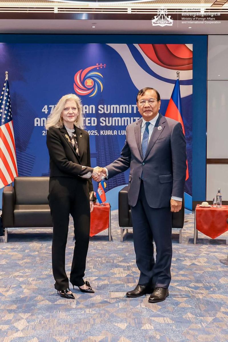 នៅរសៀលថ្ងៃទី២៧ ខែតុលា ឆ្នាំ២០២៥ នេះ ឯកឧត្តមឧបនាយករដ្ឋមន្ត្រី ប្រាក់ សុខុន រដ្ឋមន្ត្រីការបរទេស និងសហប្រតិបត្តិការអន្តរជាតិ បានអញ្ជើញជួបពិភាក្សាទ្វេភាគីជាមួយ លោកជំទាវ Allison Hooker អនុរដ្ឋលេខាធិការ ទទួលបន្ទុកនយោបាយ នៃក្រសួងការបរទេសសហរដ្ឋអាម៉េរិក ក្នុងឱកាសអញ្ជើញចូលរួមកិច្ចប្រជុំកំពូលអាស៊ាន លើកទី៤៧ និងកិច្ចប្រជុំពាក់ព័ន្ធ នៅទីក្រុងគូឡាឡាំពួ ប្រទេសម៉ាឡេស៊ី។
