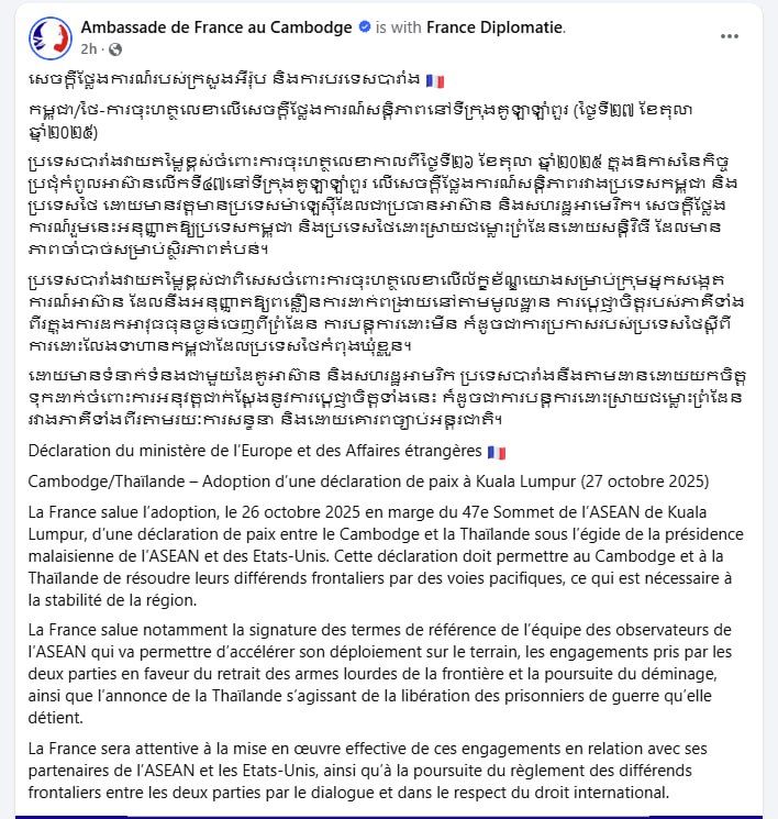 ដោយមានទំនាក់ទំនងជាមួយដៃគូអាស៊ាន និងសហរដ្ឋអាមរិក ប្រទេសបារាំងនឹងតាមដានដោយយកចិត្តទុកដាក់ចំពោះការអនុវត្តជាក់ស្តែងនូវការប្តេជ្ញាចិត្តរបស់កម្ពុជា និងថៃ លើការចុះហត្ថលេខាលើសេចក្តីថ្លែងការណ៍សន្តិភាពនៅទីក្រុងគូឡាឡាំពួរ កាលពីថ្ងៃទី២៦ ខែតុលា ឆ្នាំ២០២៥។