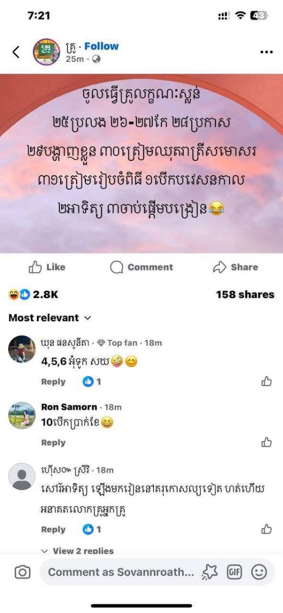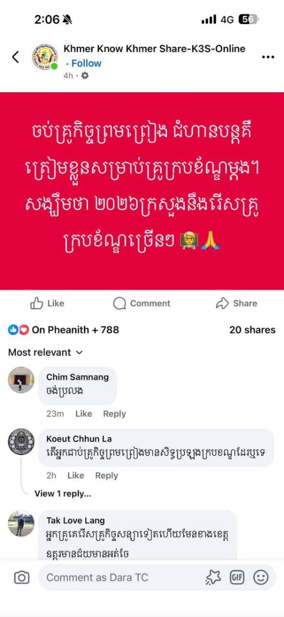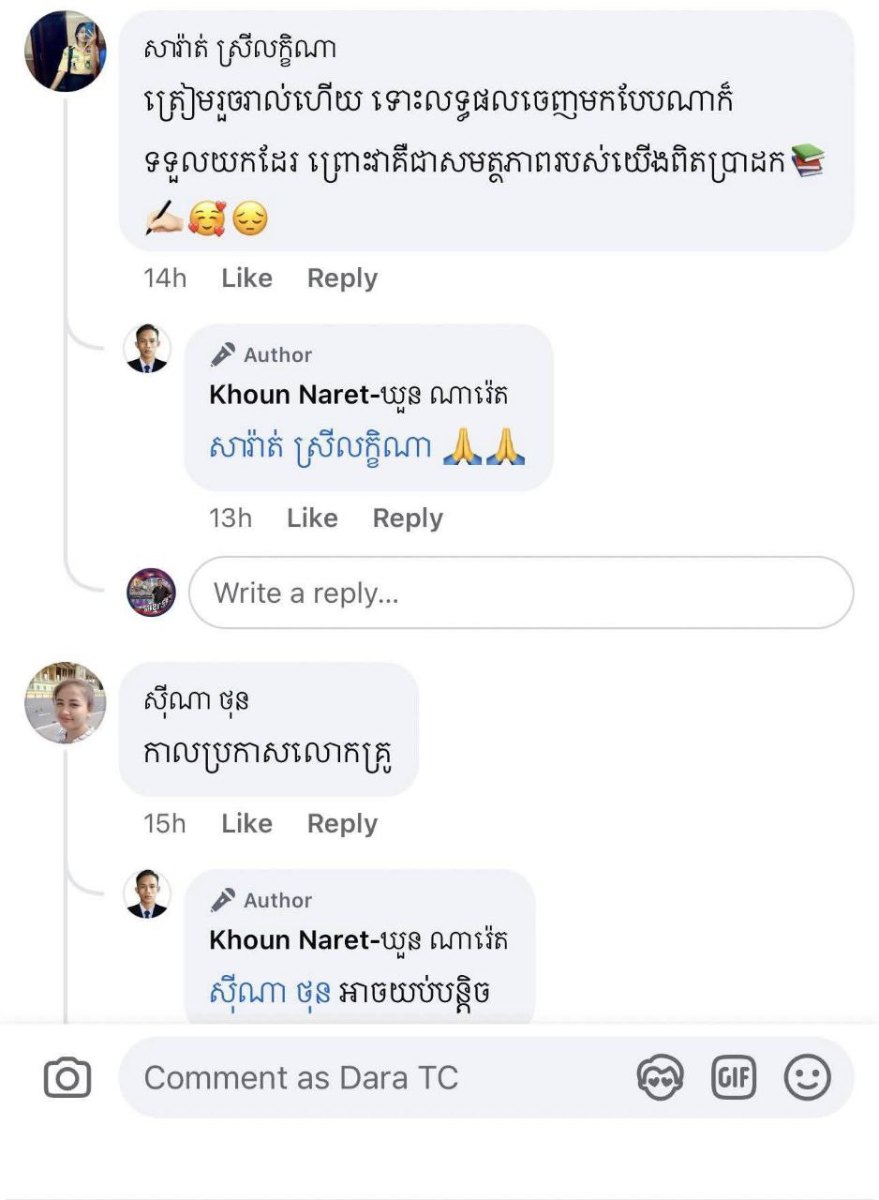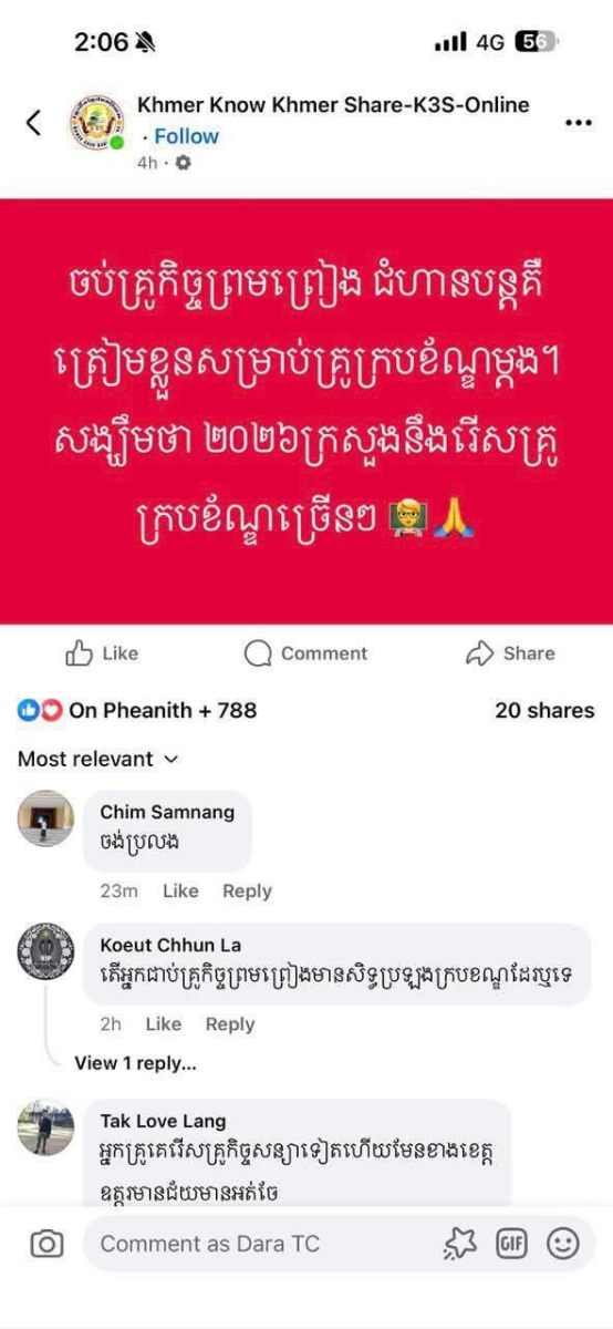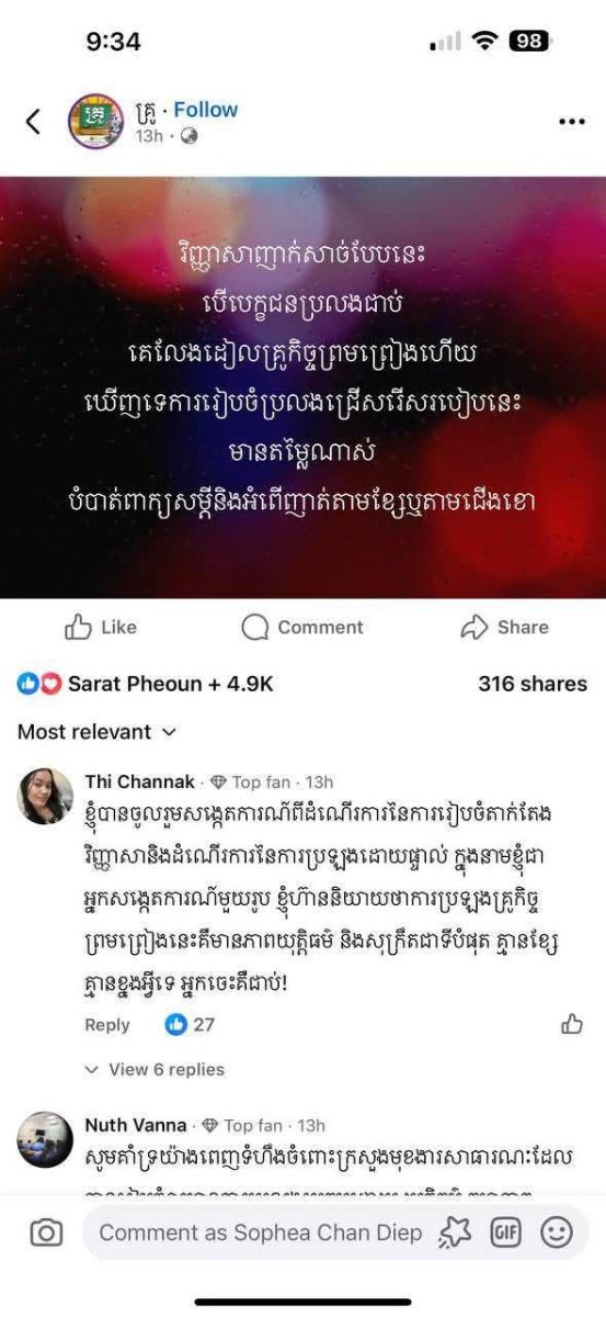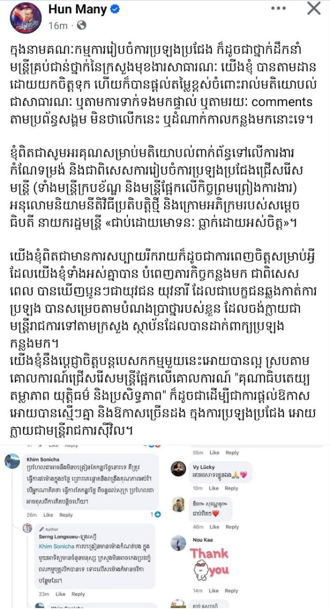 ឯកឧត្តមបានសរសេរនៅលើបណ្ដាញសង្គមហ្វេសប៊ុកថា ក្នុងនាមគណៈកម្មការរៀបចំការប្រឡងប្រជែង ក៏ដូចជាថ្នាក់ដឹកនាំមន្ត្រីគ្រប់ជាន់ថ្នាក់នៃក្រសួងមុខងារសាធារណៈ គឺបានតាមដានដោយយកចិត្តទុក ហើយក៏បានផ្តល់តម្លៃខ្ពស់ចំពោះរាល់មតិយោបល់ជាសាធារណៈ ឬតាមការទាក់ទងមកផ្ទាល់ ឬតាមរយៈ comments តាមប្រព័ន្ធសង្គមមិនថាលើកនេះឬដំណាក់កាលកន្លងមកនោះទេ។