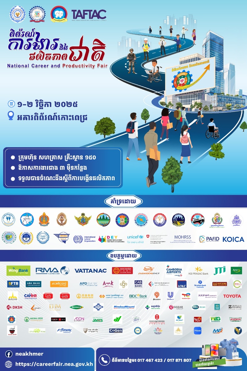 លោក ស៊ុន មេសា អ្នកនាំពាក្យក្រសួងការងារ និងបណ្តុះបណ្តាលវិជ្ជាជីវៈ បានមានប្រសាសន៍ថា ពិព័រណ៍ការងារ និងផលិតភាពជាតិ ឆ្នាំនេះ ធ្វើឡើងក្រោមប្រធានបទ «វិថីឆ្ពោះទៅរកផលិតភាព៖ ផ្សារភ្ជាប់ជំនាញ បច្ចេកវិទ្យា និងឱកាសការងារ» មានរយៈពេល ២ថ្ងៃ គឺថ្ងៃទី១-២ ខែវិច្ឆិកា ឆ្នាំ២០២៥ ដោយទទួលបានការគាំទ្រពីអង្គការអន្តរជាតិខាងការងារ ទីភ្នាក់ងារសហប្រតិបត្តិការអន្តរជាតិកូរ៉េ មូលនិធិអភិវឌ្ឍន៍ជំនាញ និងដៃគូពាក់ព័ន្ធជាច្រើនទៀត។