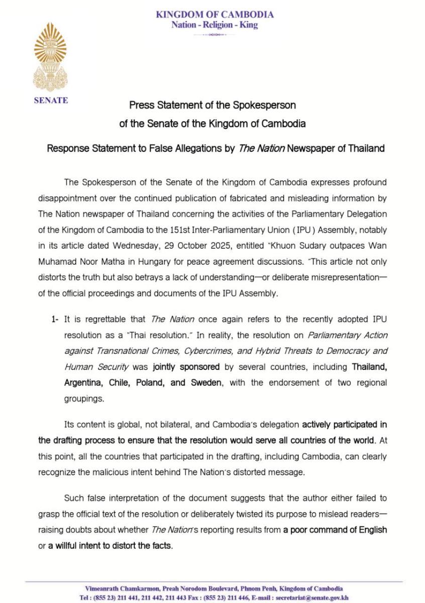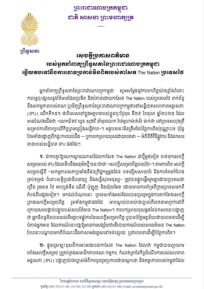 តាមរយៈសេចក្ដីប្រកាសព័ត៌មាន អ្នកនាំពាក្យព្រឹទ្ធសភាកម្ពុជា សម្តែងនូវការខកចិត្តយ៉ាងខ្លាំងចំពោះការបន្តចុះផ្សាយនូវព័ត៌មានដែលប្រឌិត និងបំភាន់ដោយកាសែត The Nation របស់ប្រទេសថៃពាក់ព័ន្ធ នឹងសកម្មភាពរបស់គណៈប្រតិភូព្រឹទ្ធសភាកម្ពុជានៅសន្និបាតសហភាពអន្តរសភា (IPU) លើកទី១៥១ ជាពិសេសនៅក្នុងអត្ថបទរបស់ខ្លួនចុះថ្ងៃទី២៩ ខែតុលា ឆ្នាំ២០២៥ ដែលមានចំណងជើងថា «លោកជំទាវ យួន សុដារី នាំមុខលោក វ៉ាន់មូហាម៉ាត់ន័រ ម៉ាក់ថា នៅប្រទេសហុងគ្រី សម្រាប់ការពិភាក្សាលើកិច្ចព្រមព្រៀងសន្តិភាព»។ អត្ថបទនេះមិនត្រឹមតែបំភ្លៃការពិតប៉ុណ្ណោះទេ ប៉ុន្តែថែមទាំងបង្ហាញពីកង្វះការយល់ដឹង – ឬការបកស្រាយខុសដោយចេតនា អំពីនីតិវិធីផ្លូវការ និងឯកសារនានារបស់សន្និបាត IPU ផងដែរ។