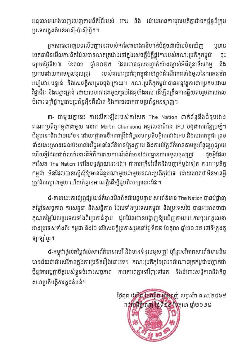 អ្នកនាំពាក្យព្រឹទ្ធសភាកម្ពុជាបង្ហាញការគួរឱ្យសោកស្តាយដែលកាសែត The Nation ជាថ្មីម្តងទៀតចាត់ទុកសេចក្តី សម្រេចរបស់ IPU ដែលទើបនឹងអនុម័តថ្មីៗនេះថាជា “សេចក្តីសម្រេចចិត្តរបស់ថៃ»។ តាមការពិត សេចក្តីសម្រេចស្តីពី «សកម្មភាពសភាប្រឆាំងនឹងឧក្រិដ្ឋកម្មឆ្លងដែន បទល្មើសសាយប័រ និងការគំរាមកំហែង គ្រប់ទម្រង់ ចំពោះលទ្ធិប្រជាធិបតេយ្យ និងសន្តិសុខមនុស្ស» ត្រូវបានផ្តួចផ្តើមរួមគ្នាដោយប្រទេសជា ច្រើនរួមមាន ថៃ អាហ្សង់ទីន ឈីលី ប៉ូឡូញ និងស៊ុយអែត ដោយមានការគាំទ្រពីក្រុមប្រទេសមកពី តំបន់ពីរផ្សេងទៀត។ មកដល់ចំណុចនេះ ប្រទេសទាំងអស់ដែលបានចូលរួមក្នុងការតាក់តែងសេចក្តី ព្រាងសេចក្តីសម្រេចចិត្តរួមទាំងកម្ពុជាផងដែរ អាចស្គាល់បានយ៉ាងច្បាស់ពីចេតនាអាក្រក់នៅពីក្រោយសារបង្កាច់បង្អួចរបស់សារព័ត៌មាន The Nation។ ការបកស្រាយខុសឆ្គងនៃឯកសារនេះបង្ហាញថា អ្នកនិពន្ធមិនបានយល់ពីអត្ថបទផ្លូវការនៃសេចក្តីសម្រេចចិត្ត ឬបានបំភ្លៃអត្ថន័យដោយចេតនា ដើម្បីបំភាន់អ្នកអាន ដែលការណ៍នេះបង្កឱ្យមានការសង្ស័យថាតើរបាយការណ៍របស់សារពត៌មាន The Nation បែបនេះបណ្តាលមកពីចំណេះដឹងភាសាអង់គ្លេសនៅទន់ខ្សោយ ឬជាចេតនាដើម្បីបំភ្លៃការពិត។