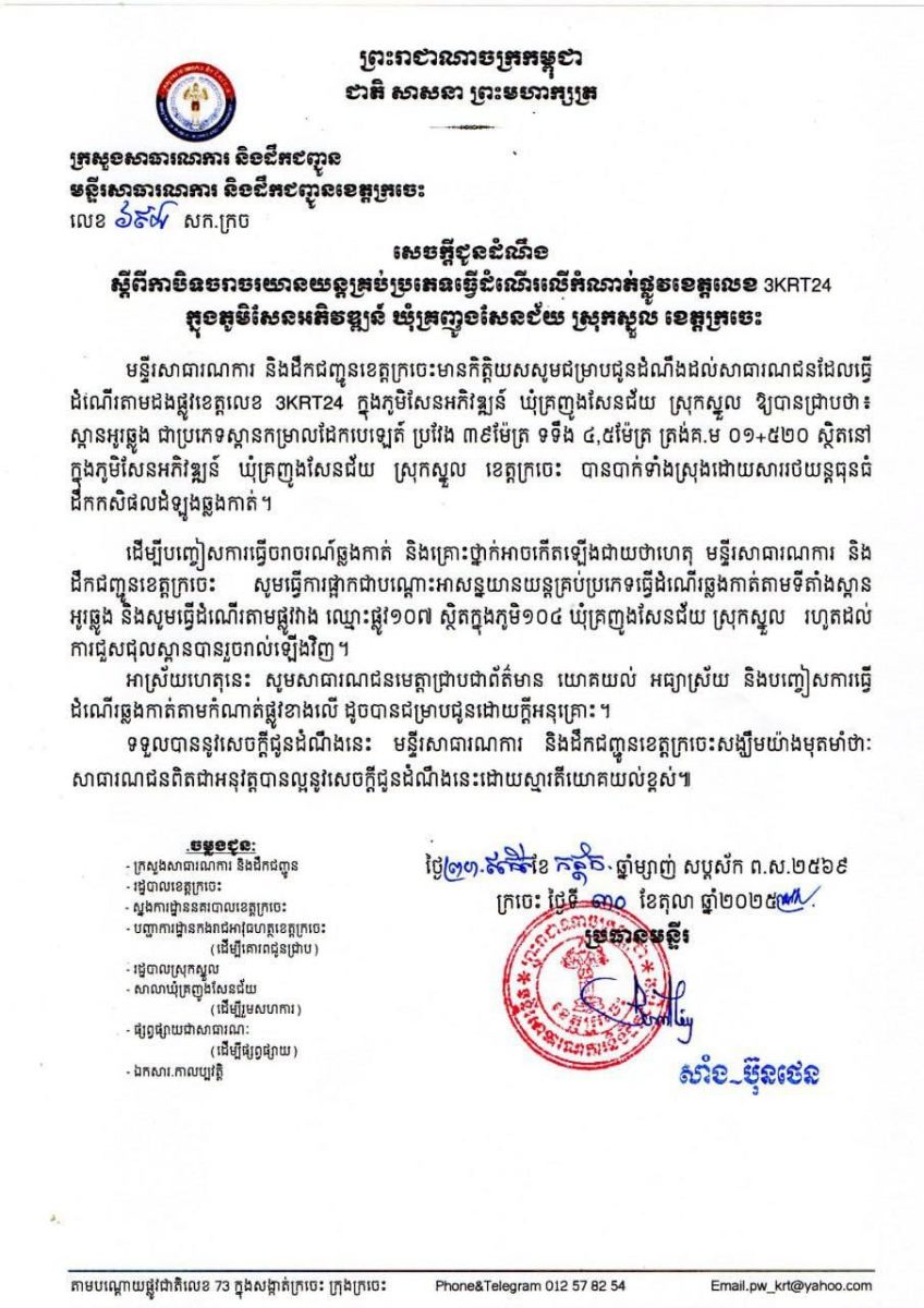 ហេតុការណ៍នេះ បានកើតឡើងកាលពីវេលាម៉ោង ៧និង០០ព្រឹកថ្ងៃទី៣០ ខែតុលាឆ្នាំ២០២៥ នៅចំណុចស្ពានឆ្លូង ស្ថិតក្នុងភូមិសែនអភិវឌ្ឍន៍ ឃុំគ្រញូងសែនជ័យ ស្រុកស្នួល ខេត្តក្រចេះ។