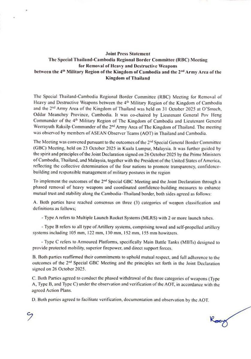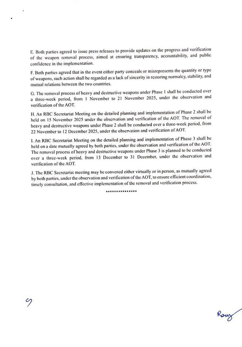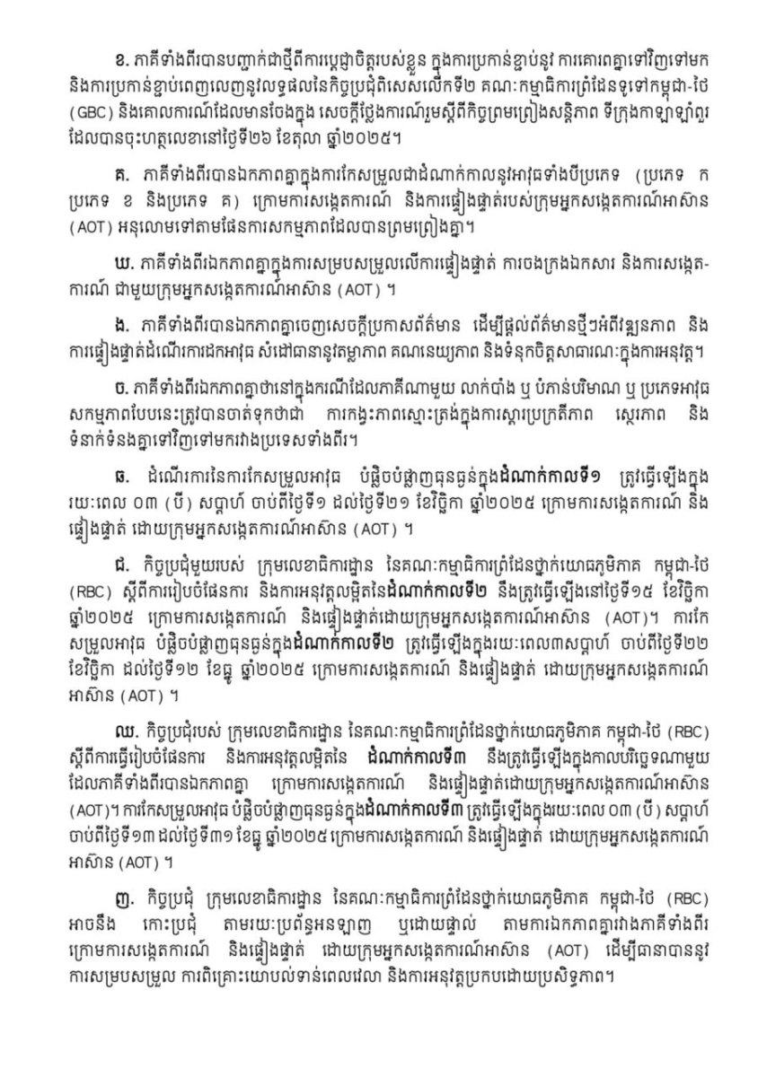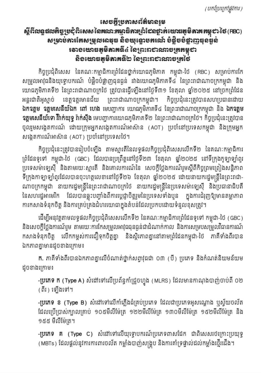 ជ. កិច្ចប្រជុំមួយរបស់ ក្រុមលេខាធិការដ្ឋាន នៃគណៈកម្មាធិការព្រំដែនថ្នាក់យោធភូមិភាគ កម្ពុជា-ថៃ (RBC) ស្តីពី ការរៀបចំផែនការ និងការអនុវត្តលម្អិតនៃដំណាក់កាលទី២ នឹងត្រូវធ្វើឡើងនៅថ្ងៃទី១៥ ខែវិច្ឆិកា ឆ្នាំ២០២៥ ក្រោមការសង្កេតការណ៍ និងផ្ទៀងផ្ទាត់ដោយក្រុមអ្នកសង្កេតការណ៍អាស៊ាន (AOT)។ ការកែសម្រួលអាវុធបំផ្លិចបំផ្លាញធុនធ្ងន់ក្នុងដំណាក់កាលទី២ ត្រូវធ្វើឡើងក្នុងរយៈពេល៣សប្តាហ៍ ចាប់ពីថ្ងៃទី២២ ខែវិច្ឆិកា ដល់ថ្ងៃទី១២ ខែធ្នូ ឆ្នាំ២០២៥ ក្រោមការសង្កេតការណ៍ និងផ្ទៀងផ្ទាត់ ដោយក្រុមអ្នកសង្កេតការណ៍អាស៊ាន (AOT) ។