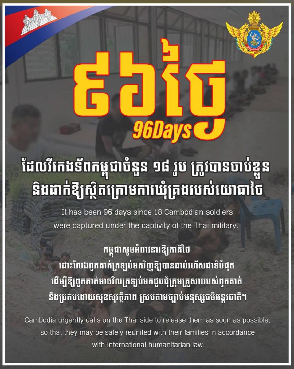ប្រជាពលរដ្ឋខ្មែរ នៅស្រុកជាំក្សាន្ដ ខេត្ដព្រះវិហារ បានបន្ដអំពាវនាវដល់សហគមន៍អន្តរជាតិ ឱ្យជំរុញថៃឱ្យដោះលែងកងទ័ពកម្ពុជា១៨រូបមកកម្ពុជាវិញ ដើម្បីបានជួបក្រុមគ្រួសារពួកគាត់ ខណៈដែលប្រទេសទាំងពីរ បានចុះហត្ថលេខាកិច្ចព្រមព្រៀងសន្ដិភាព ដែលមានសាក្សីច្បាស់លាស់ពីសហគមន៍អន្ដរជាតិ ជាពិសេសសហរដ្ឋអាមេរិក។