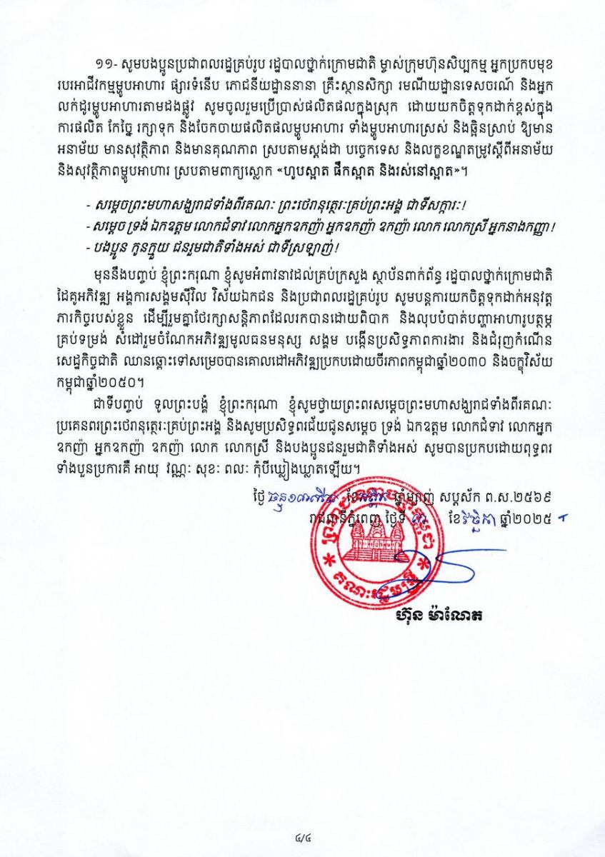 ១១- សូមបងប្អូនប្រជាពលរដ្ឋគ្រប់រូប រដ្ឋបាលថ្នាក់ក្រោមជាតិ ម្ចាស់ក្រុមហ៊ុនសិប្បកម្ម អ្នកប្រកបមុខ របរអាជីវកម្មម្ហូបអាហារ ផ្សារទំនើប ភោជនីយដ្ឋាននានា គ្រឹះស្ថានសិក្សា រមណីយដ្ឋានទេសចរណ៍ និងអ្នក លក់ដូរម្ហូបអាហារតាមដងផ្លូវ សូមចូលរួមប្រើប្រាស់ផលិតផលក្នុងស្រុក ដោយយកចិត្តទុកដាក់ខ្ពស់ក្នុង ការផលិត កែច្នៃ រក្សាទុក និងចែកចាយផលិតផលម្ហូបអាហារ ទាំងម្ហូបអាហារស្រស់ និងឆ្អិនស្រាប់ ឱ្យមាន អនាម័យ មានសុវត្ថិភាព និងមានគុណភាព ស្របតាមស្ដង់ដា បច្ចេកទេស និងលក្ខខណ្ឌតម្រូវស្តីពីអនាម័យ និងសុវត្ថិភាពម្ហូបអាហារ ស្របតាមពាក្យស្លោក «ហូបស្អាត ផឹកស្អាត និងរស់នៅស្អាត»។