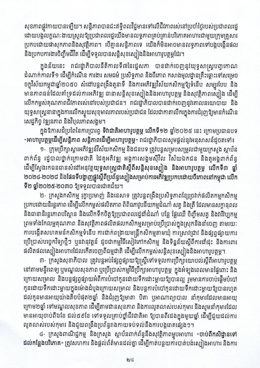 ២- ក្រសួងកសិកម្ម រុក្ខាប្រមាញ់ និងនេសាទ ត្រូវបន្តពង្រឹងប្រសិទ្ធភាពខ្សែច្រវាក់ផលិតកម្មកសិកម្ម ប្រកបដោយនិរន្តរភាព ដើម្បីលើកកម្ពស់ផលិតភាព ពិពិធភាវូបនីយកម្មដំណាំ សត្វ និងត្រី ដែលមានសក្តានុពល និងធានានិរន្តរភាពបរិស្ថាន និងលើកទឹកចិត្តឱ្យប្រជាពលរដ្ឋដាំដំណាំ បន្លែ ផ្លែឈើ ចិញ្ចឹមសត្វ និងវារីវប្បកម្ម ព្រមទាំងកែលម្អគុណភាព និងសុវត្ថិភាពផលិតផលកសិកម្មសម្រាប់ប្រើប្រាស់ក្នុងស្រុកនិងនាំចេញ តាមរយៈ ការបង្កើតសហគមន៍កសិកម្មទំនើប ការដាក់ពង្រាយមន្ត្រីកសិកម្មតាមឃុំ ការស្រាវជ្រាវ និងផ្សព្វផ្សាយការ ប្រើប្រាស់បច្ចេកវិទ្យាថ្មីៗ ឬនវានុវត្តន៍ ដូចជាកម្មវិធីសៀវភៅកសិកម្ម និងទិន្នន័យស្តីពីការដាំដុះ និងការពារ ផលិតផលស្បៀងអាហារដែលកើតចេញពីធម្មជាតិ ដើម្បីលើកកម្ពស់សន្តិសុខស្បៀងនិងអាហារូបត្ថម្ភ។