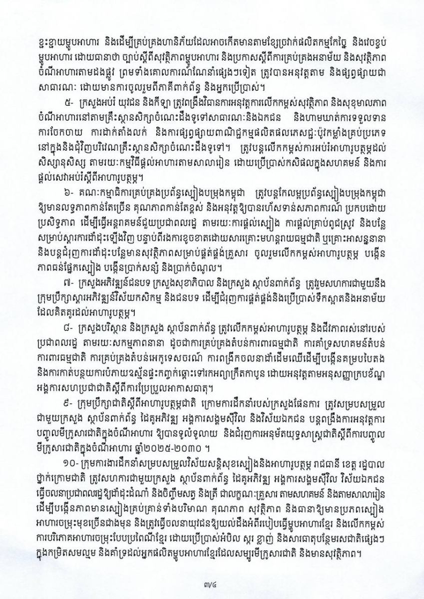 ៥- ក្រសួងអប់រំ យុវជន និងកីឡា ត្រូវពង្រឹងវិធានការអនុវត្តការលើកកម្ពស់សុវត្ថិភាព និងសុខុមាលភាព ចំណីអាហារនៅតាមគ្រឹះស្ថានសិក្សាចំណេះដឹងទូទៅសាធារណៈនិងឯកជន និងហាមឃាត់ការទទួលទាន