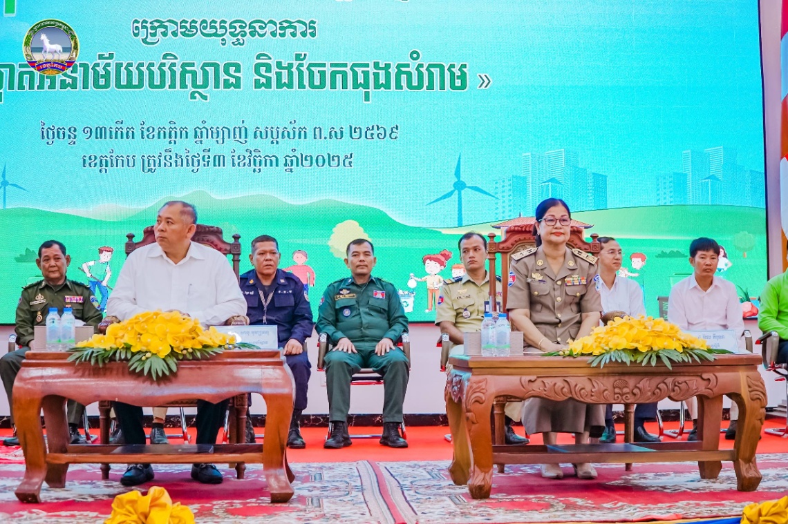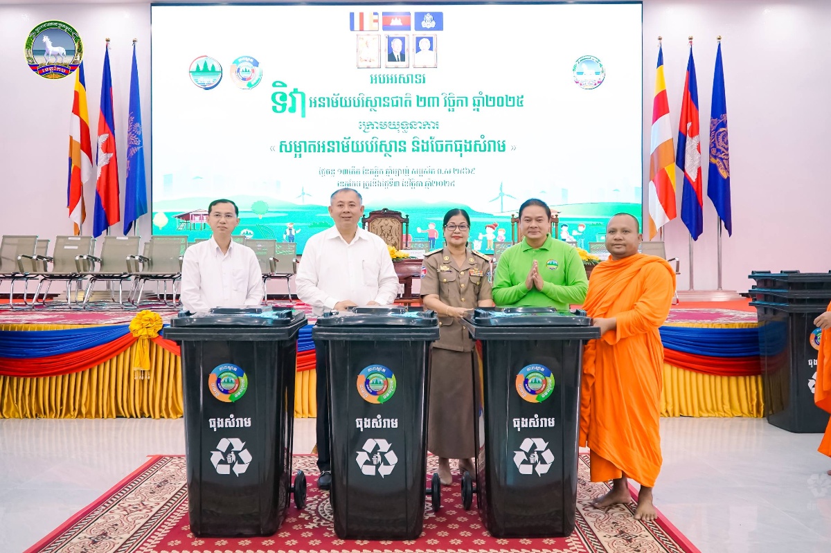 នៅថ្ងៃទី៣ ខែវិច្ឆិកា ឆ្នាំ២០២៥ ឯកឧត្តម សាបូ អូហ្សាណូ រដ្ឋលេខាធិការក្រសួងបរិស្ថាន និងជាតំណាងឯកឧត្តមបណ្ឌិត អ៊ាង សុផល្លែត រដ្ឋមន្រ្តីក្រសួងបរិស្ថាន បានអញ្ជើញចូលរួមជាអធិបតីប្រារព្ធទិវាអនាម័យបរិស្ថានជាតិ ២៣វិច្ឆិកា ឆ្នាំ២០២៥ ក្រោមយុទ្ធនាការ «សម្អាតអនាម័យបរិស្ថាន និងចែកធុងសំរាម» ជូនដល់មូលដ្ឋានសុខាភិបាល សាលារៀន និងវត្តអារាម ព្រមទាំងសាលាឃុំ-សង្កាត់នៅទូទាំងខេត្តកែប ចំនួន ១៥៤ធុង ដោយមានការចូលរួមពីថ្នាក់ដឹកនាំនិងមន្រ្តីរាជការក្រសួងបរិស្ថាន តំណាងរដ្ឋបាលខេត្ត មន្ទីរបរិស្ថានខេត្ត មន្ទីរ អង្គភាព ព្រះសង្ឃ និងប្រជាពលរដ្ឋជាច្រើននាក់ នៅខេត្តកែប។