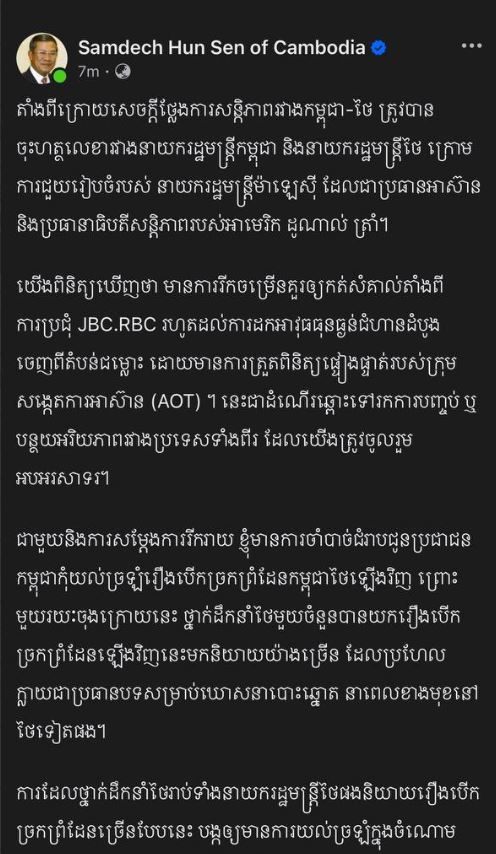 តាមរយៈបណ្ដាញសង្គមនាយប់ថ្ងៃទី៤ ខែវិច្ឆិកា ឆ្នាំ២០២៥នេះ សម្ដេចតេជោ ហ៊ុន សែន បានលើកឡើងថា តាំងពីក្រោយសេចក្តីថ្លែងការណ៍សន្កិភាពរវាងកម្ពុជា-ថៃ ត្រូវបានចុះហត្ថលេខារវាងនាយករដ្ឋមន្ត្រីកម្ពុជា និងនាយករដ្ឋមន្ត្រីថៃ ក្រោមការជួយរៀបចំរបស់ នាយករដ្ឋមន្ត្រីម៉ាឡេស៊ីដែលជាប្រធានអាស៊ាន និងប្រធានាធិបតីសន្តិភាពរបស់អាមេរិក ដូណាល់ ត្រាំ។