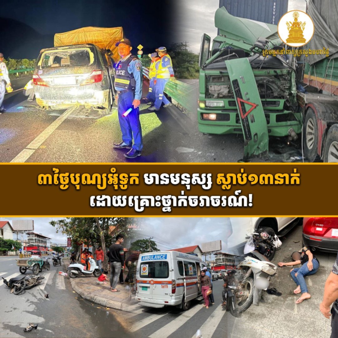 ៣ថ្ងៃបុណ្យអុំទូក គ្រោះថ្នាក់ចរាចរណ៍បណ្ដាលឱ្យមនុស្សស្លាប់១៣នាក់ និងរងរបួសធ្ងន់ស្រាល៣៣នាក់