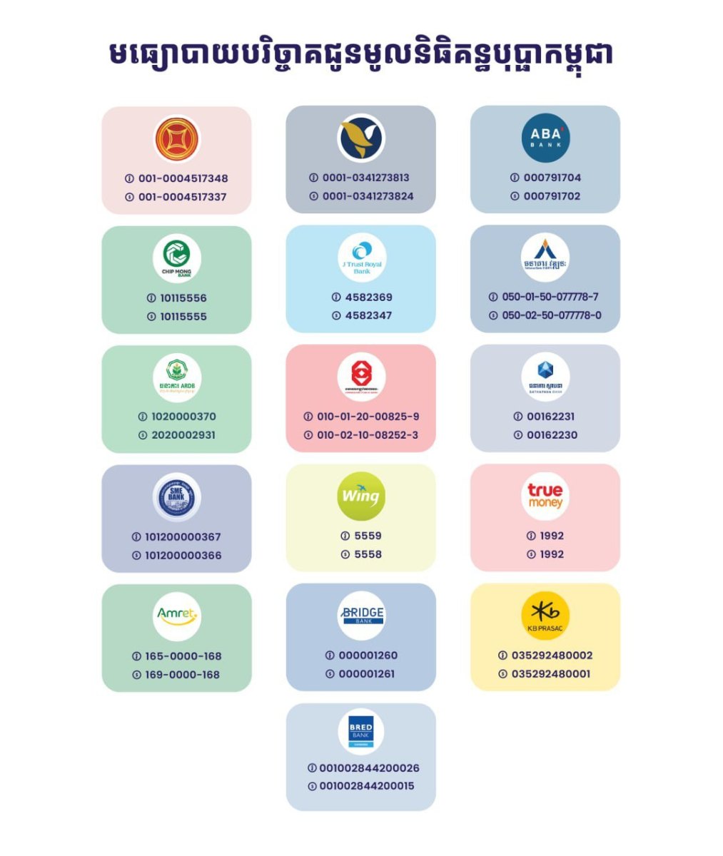 សម្រាប់សាធារណជនដែលមាទឹកចិត្តសប្បុរស និងមានបំណងចូលរួមនាំក្ដីសង្ឃឹម និងភាពញញឹមដល់ទារក និងកុមារ ព្រមទាំងស្ត្រីមានផ្ទៃពោះ, សូមចូលរួមបរិច្ចាគជូនមូលនិធិគន្ធបុប្ផាកម្ពុជា តាមរយៈ មធ្យោបាយបរិច្ចាគដោយឥតគិតថ្លៃសេវាជាមួយគ្រឹះស្ថានហិរញ្ញវត្ថុជាដៃគូ ដូចមានក្នុងរូបភាពជូនភ្ជាប់ ឬតាមរយៈការទំនាក់ទំនងលេខទូរសព្ទ ០៦១ ៧០ ១១១១ ៕