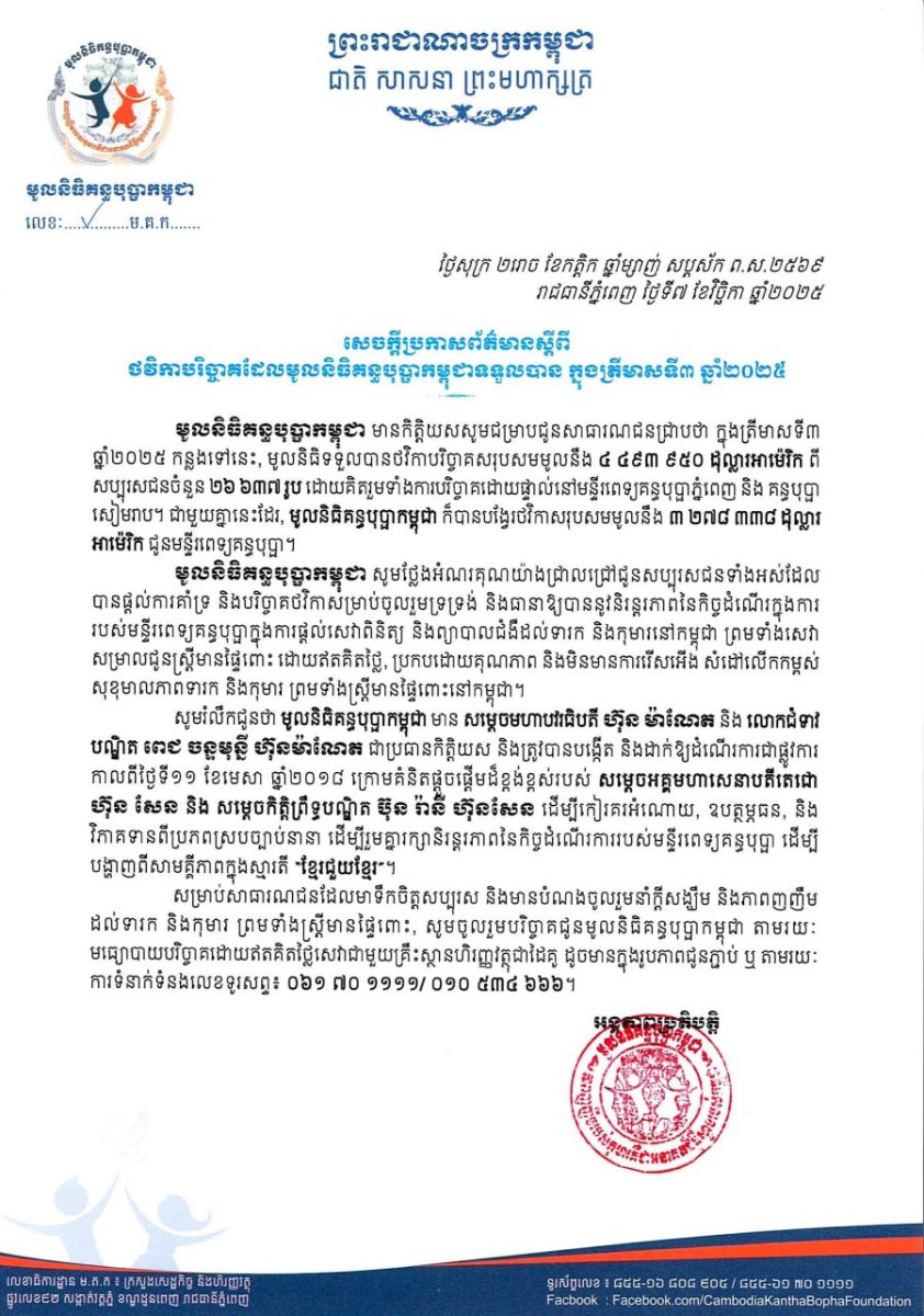 ក្នុងត្រីមាសទី៣ ឆ្នាំ២០២៥ មូលនិធិទទួលបានថវិកាបរិច្ចាគ សរុបសមមូលនឹង ៤ ៤៩៣ ៩៥០ ដុល្លារអាម៉េរិក ពីសប្បុរសជន
