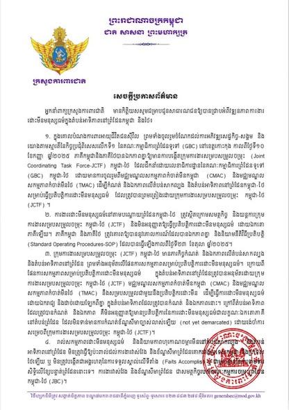 ១. ក្នុងគោលបំណងការពារអាយុជីវិតជនស៊ីវិល ព្រមទាំងចូលរួមចំណែកដល់ការអភិវឌ្ឍសេដ្ឋកិច្ច-សង្គម និង យោងតាមស្មារតីនៃកិច្ចប្រជុំពិសេសលើកទី១ នៃគណៈកម្មាធិការព្រំដែនទូទៅ (GBC) នៅខេត្តកោះកុង កាលពីថ្ងៃទី១០ ខែកញ្ញា ឆ្នាំ២០២៥ ភាគីកម្ពុជានិងភាគីថៃបានឯកភាពគ្នា ឱ្យមានការបង្កើតក្រុមការងារសម្របសម្រួលចម្រុះ (Joint Coordinating Task Force-JCTF) កម្ពុជា-ថៃ ដែលដឹកនាំដោយលេខាធិការដ្ឋាននៃគណៈកម្មាធិការព្រំដែន ទូទៅ (GBC) កម្ពុជា-ថៃ ដោយមានការចូលរួមពីមជ្ឈមណ្ឌលសកម្មភាពកំចាត់មីនកម្ពុជា (CMAC) និងមជ្ឈមណ្ឌល សកម្មភាពកំចាត់មីនថៃ (TMAC) ដើម្បីកំណត់ និងឯកភាពលើតំបន់សាកល្បង និងតំបន់អាទិភាពនៅព្រំដែនកម្ពុជា-ថៃ សម្រាប់ធ្វើប្រតិបត្តិការដោះមីនមនុស្សធម៌ ដែលត្រូវបានព្រមព្រៀងដោយក្រុមការងារសម្របសម្រួលចម្រុះ កម្ពុជា-ថៃ (JCTF) ។