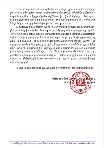 ២. ការងារដោះមីនមនុស្សធម៌នៅតាមបណ្តោយព្រំដែនកម្ពុជា-ថៃ ត្រូវស្ថិតក្រោមសមត្ថកិច្ច និងយន្តការក្រុម ការងារសម្របសម្រួលចម្រុះ កម្ពុជា-ថៃ (JCTF) និងមិនអនុញ្ញាតឱ្យធ្វើប្រតិបត្តិការដោះមីនមនុស្សធម៌ ដោយឯកតោ ភាគីឡើយ។ ភាគីកម្ពុជា និងភាគីថៃ ត្រូវគោរពឱ្យបាននូវគោលការណ៍ដែលបានឯកភាពគ្នា និងនិយាមនីតិវិធីប្រតិបត្តិ (Standard Operating Procedures-SOP) ដែលបានធ្វើឡើងកាលពីថ្ងៃទី២៣ ខែតុលា ឆ្នាំ២០២៥។