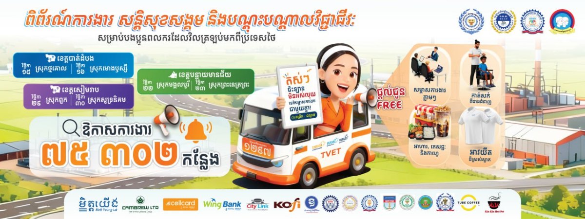 (ភ្នំពេញ)៖ ក្រសួងការងារ និងបណ្តុះបណ្តាលវិជ្ជាជីវៈ នឹងរៀបចំពិព័រណ៍ការងារ សន្តិសុខសង្គម និងបណ្តុះបណ្តាលវិជ្ជាជីវៈ នៅខេត្តធំៗចំនួន ៣គឺខេត្តបាត់ដំបង ខេត្តសៀមរាប និងខេត្តបន្ទាយមានជ័យ ដើម្បីផ្តល់ឱកាសការងារជូនប្រជាពលរដ្ឋ ជាពិសេស អតីតពលករដែលត្រឡប់មកពីប្រទេសថៃ។