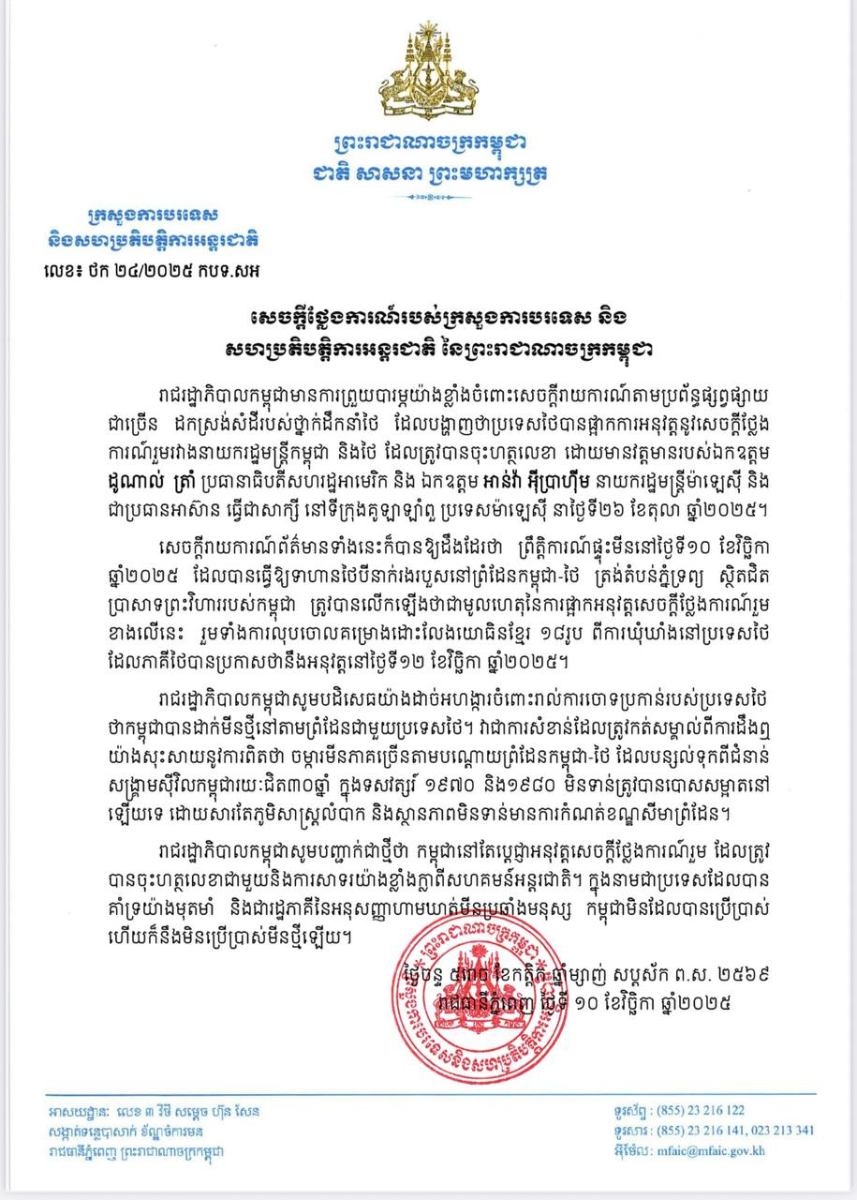 យោងតាមសេចក្តីថ្លែងការណ៍របស់ក្រសួងការបរទេស និងសហប្រតិបត្តិការអន្តរជាតិនៅយប់ថ្ងៃទី ១០ ខែវិច្ឆិកា ឆ្នាំ២០២៥នេះ បានលើកឡើងថា រាជរដ្ឋាភិបាលកម្ពុជាមានការព្រួយបារម្ភយ៉ាងខ្លាំងចំពោះសេចក្ដីរាយការណ៍តាមប្រព័ន្ធផ្សព្វផ្សាយជាច្រើន ដកស្រង់សំដីរបស់ថ្នាក់ដឹកនាំ ដែលបង្ហាញថាប្រទេសថៃបានផ្អាកការអនុវត្តនូវសេចក្តីថ្លែងការណ៍រួមរវាងនាយករដ្ឋមន្ត្រីកម្ពុជា និងថៃ ដែលត្រូវបានចុះហត្ថលេខា ដោយមានវត្តមានរបស់ឯកឧត្តម ដូណាល់ ត្រាំ ប្រធានាធិបតីសហរដ្ឋអាមេរិក និងឯកឧត្តម អាន់វ៉ា អ៊ីប្រាហ៊ីម នាយករដ្ឋមន្ដ្រីម៉ាឡេស៊ី និងជាប្រធានអាស៊ាន ធ្វើជាសាក្សី នៅទីក្រុងគូឡាឡាំពួ ប្រទេសម៉ាឡេស៊ី នាថ្ងៃទី២៦ ខែតុលា ឆ្នាំ២០២៥កន្លងទៅថ្មីៗនេះ។