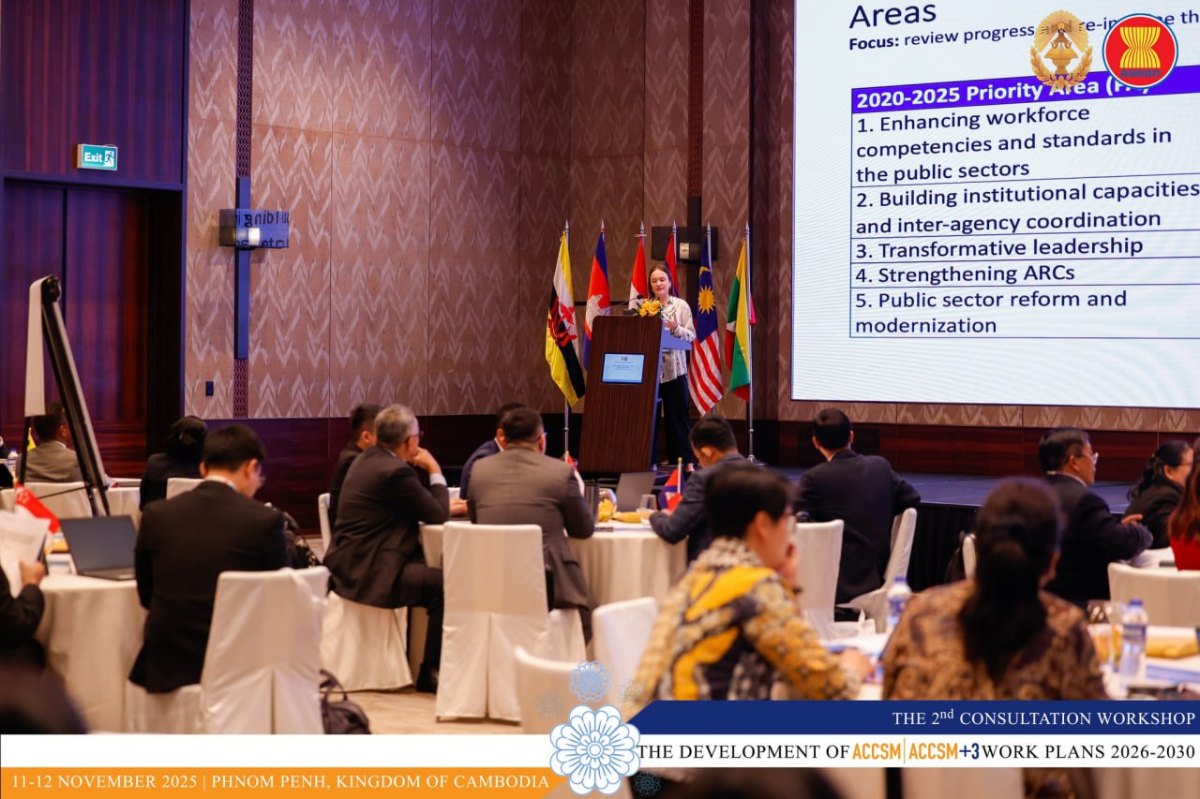 បន្ទាប់ពីបានសហការរៀបចំសិក្ខាសាលាពិគ្រោះយោបល់ជាលើកទី១ ដើម្បីអភិវឌ្ឍផែនការការងារ៥ឆ្នាំ សម្រាប់កិច្ចការសហប្រតិបត្តិការអាស៊ានស្តីពី «កិច្ចការមុខងារសាធារណៈ ACCSM និង ACCSM+3 ឆ្នាំ២០២៦-២០៣០» ដែលបានប្រព្រឹត្តទៅកាលពីថ្ងៃទី៩ ដល់ថ្ងៃទី១០ ខែកក្កដា ឆ្នាំ២០២៥ កន្លងមក នាថ្ងៃទី១១ ខែវិច្ឆិកា ឆ្នាំ២០២៥ នេះ ក្រសួងមុខងារសាធារណៈ និងលេខាធិការដ្ឋានអាស៊ាន បានសហការរៀបចំសិក្ខាសាលាពិគ្រោះយោបល់លើកទី២ ស្តីពី «ការអភិវឌ្ឍផែនការការងារ ACCSM និង ACCSM+3 ឆ្នាំ២០២៦-២០៣០»។