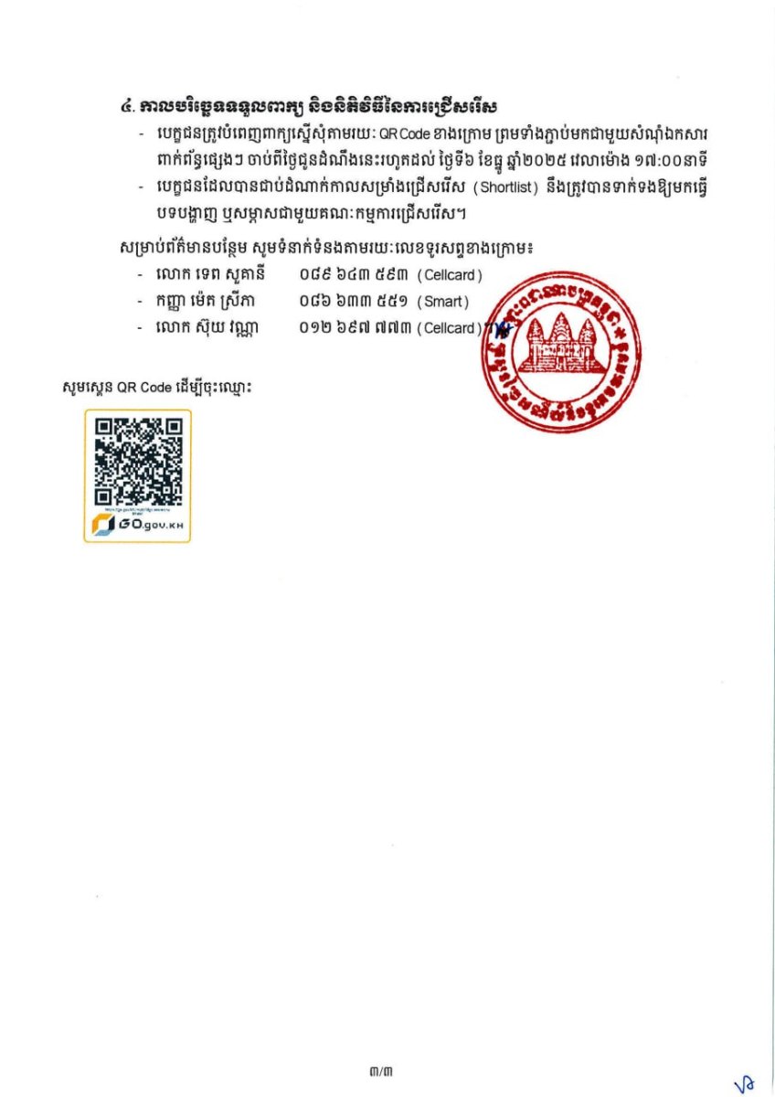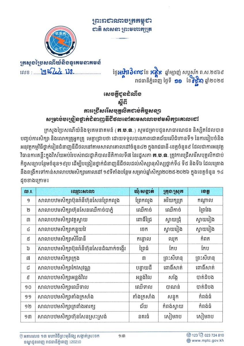ក្រសួងប្រៃសណីយ៍និងទូរគមនាគមន៍ (ក.ប.ទ.) សូមជម្រាបជូនសាធារណជន និស្សិតដែលបានបញ្ចប់ការសិក្សា និងលោកគ្រូអ្នកគ្រូ មេត្តាជ្រាបថា ដោយទទួលបានភាពជោគជ័យលើជំហានទី១ នៃការរៀបចំនិងអនុវត្តកម្មវិធីថ្នាក់រៀនជំនាញឌីជីថលនៅតាមសាលាគោលដៅចំនួន៤២ ក្នុងរាជធានី-ខេត្តចំនួន៩ ដែលជាការអនុវត្តវិធានការគន្លឹះក្នុងវិស័យអប់រំរបស់រាជរដ្ឋាភិបាលនីតិកាលទី៧ នៃរដ្ឋសភា ក.ប.ទ. ត្រូវការជ្រើសរើសបុគ្គលិកជាប់កិច្ចសន្យាបន្ថែមចំនួន១៩រូប ដើម្បីបង្រៀនថ្នាក់ជំនាញឌីជីថលដល់សិស្សានុសិស្សថ្នាក់ទី៤ ទី៥ និងទី៦ ដែលគ្រោងនឹងពង្រីកទៅកាន់សាលាបឋមសិក្សាគោលដៅ ១៩ទីតាំងបន្ថែម សម្រាប់ឆ្នាំសិក្សា២០២៥-២០២៦ ក្នុងខេត្តចំនួន ១៤…