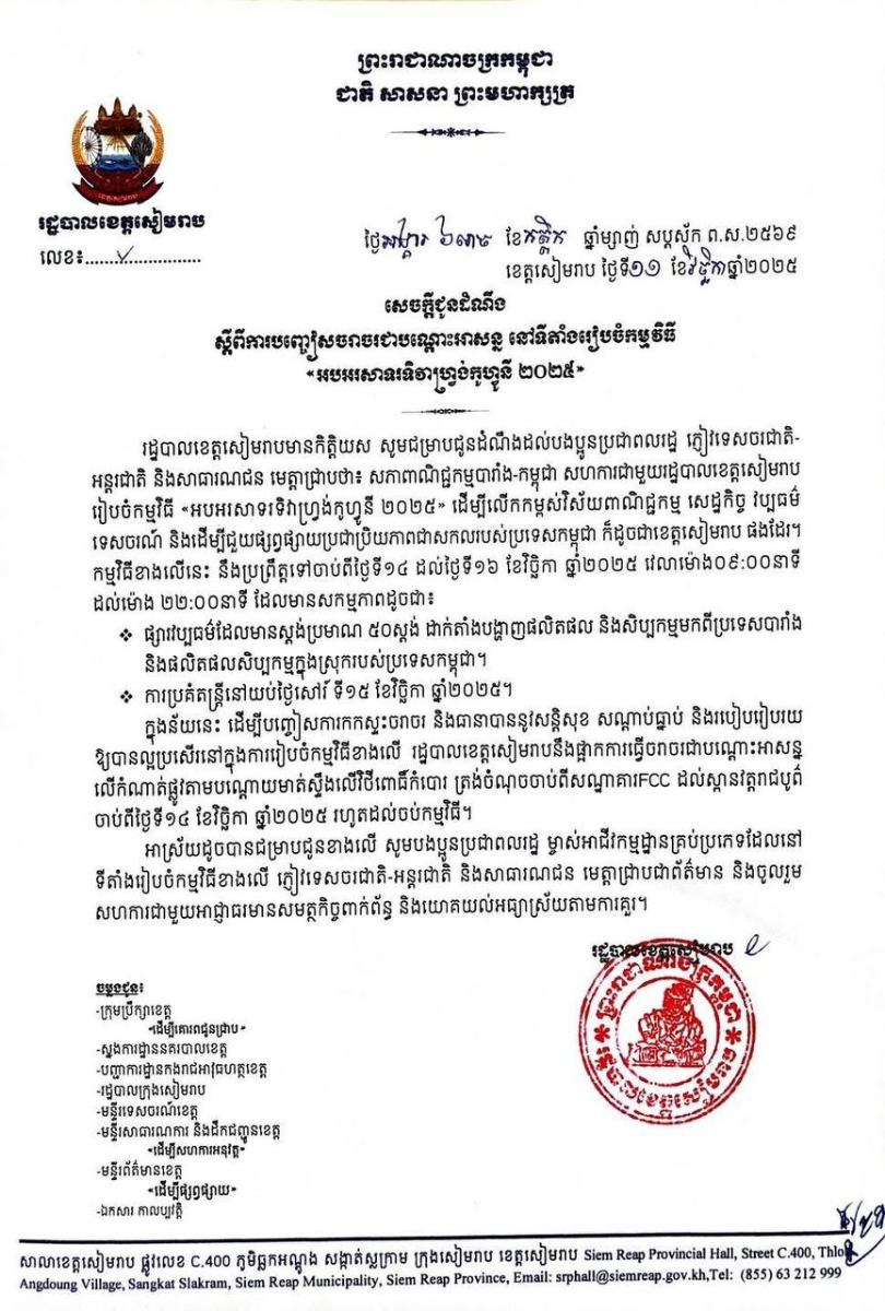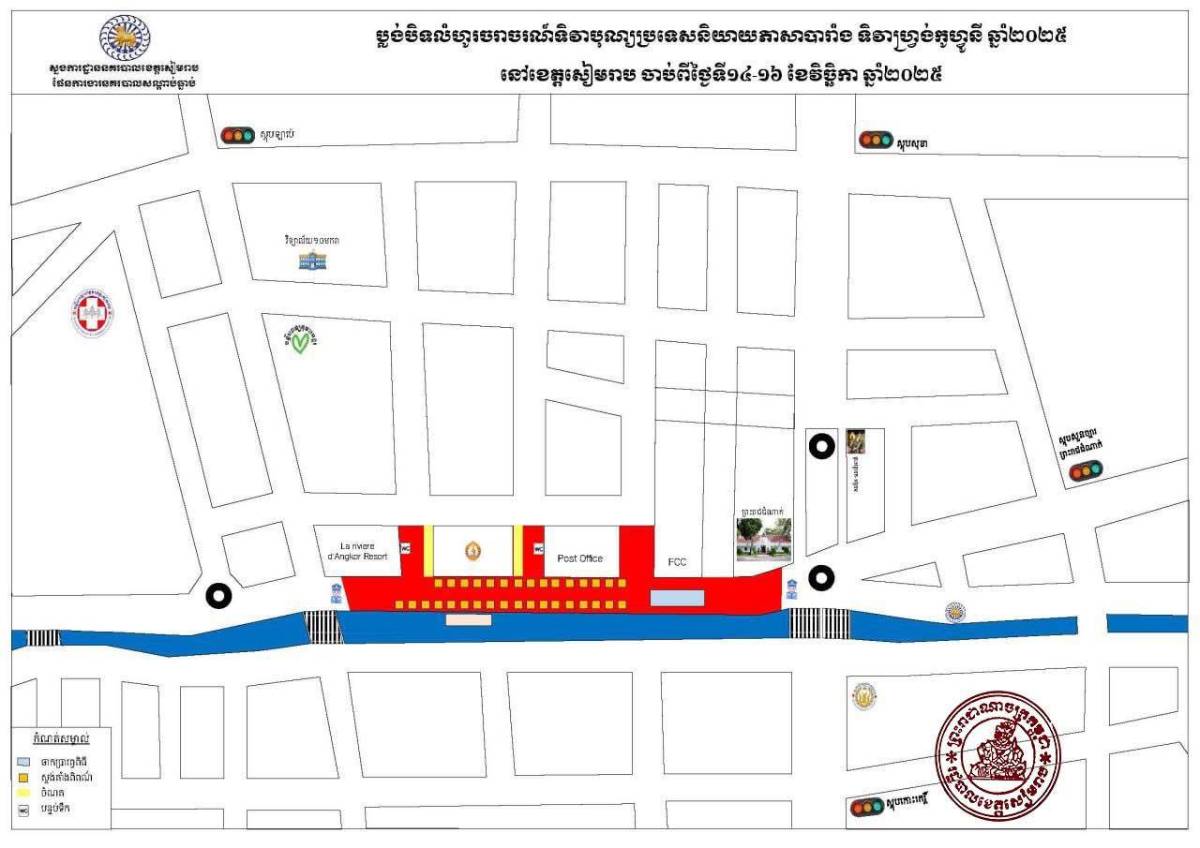 ជាមួយគ្នានេះ ដើម្បីបញ្ចៀសការកកស្ទះចរាចរ និងធានាបាននូវសន្តិសុខ សណ្តាប់ធ្នាប់ និងរបៀបរៀបរយ ឱ្យបានល្អប្រសើរនៅក្នុងការរៀបចំកម្មវិធីខាងលើ រដ្ឋបាលខេត្តសៀមរាបនឹងផ្អាកការធ្វើចរាចរជាបណ្តោះអាសន្ន លើកំណាត់ផ្លូវតាមបណ្ដោយមាត់ស្ទឹងលើវិថីពោធិ៍កំបោរ ត្រង់ចំណុចចាប់ពីសណ្ឋាគារFCC ដល់ស្ពានវត្តរាជបូព៌ ចាប់ពីថ្ងៃទី១៤ ខែវិច្ឆិកា ឆ្នាំ២០២៥ រហូតដល់ចប់កម្មវិធី។