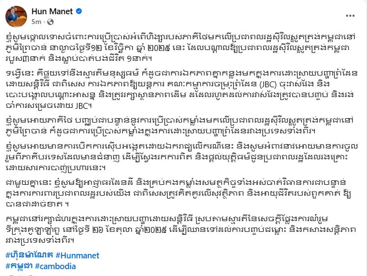 ភ្នំពេញ៖ សម្ដេចធិបតី ហ៊ុន ម៉ាណែត នាយករដ្ឋមន្រ្ដីនៃកម្ពុជា នៅយប់ថ្ងៃទី១២ ខែវិច្ឆិកា ឆ្នាំ២០២៥នេះ បាន ប្រកាសថ្កោលទោសចំពោះការប្រើប្រាស់អំពើហិង្សារបស់ភាគីថៃមកលើប្រជាពលរដ្ឋស៊ីវិលស្លូតត្រង់កម្ពុជានៅភូមិព្រៃចាន់ នាល្ងាចថ្ងៃទី១២ ខែវិច្ឆិកា ឆ្នាំ ២០២៥ នេះ ដែលបណ្តាលឱ្យប្រជាពលរដ្ឋស៊ីវិលស្លូតត្រង់កម្ពុជារបួស៣នាក់ និងស្លាប់បាត់បង់ជីវិត ១នាក់ និងស្នើឱ្យមានការបើកការស៊ើបអង្កេតឯករាជ្យលើករណីករណីនេះ។