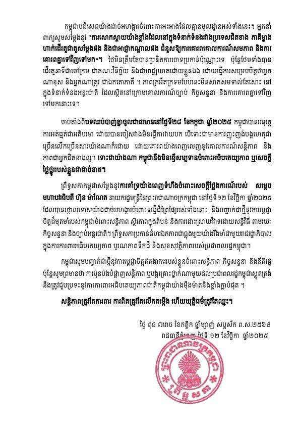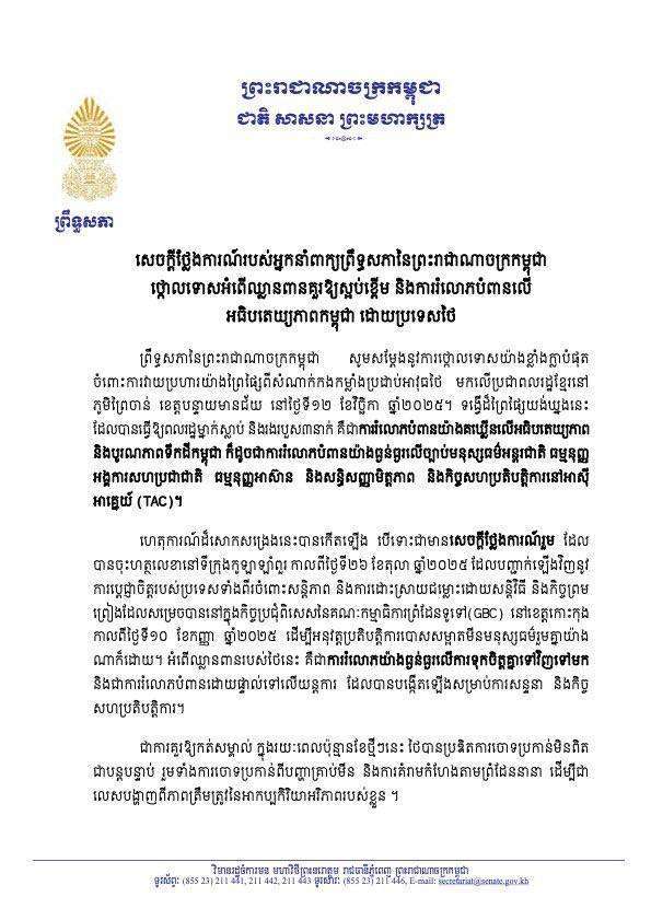អ្នកនាំពាក្យព្រឹទ្ធសភាកម្ពុជា ក៏បានចាត់ទុកថា ភាពក្រអឺតក្រទមរបស់ភាគីបែបនេះមិនសាកសមទាល់តែសោះ នៅក្នុងទំនាក់ទំនងអន្តរជាតិ ដែលស្ថិតនៅក្រោមគោលការណ៍ច្បាប់ កិច្ចសន្ទនា និងការគោរពគ្នាទៅវិញទៅមកនោះទេ។ ទន្ទឹមនោះដែរ អ្នកនាំពាក្យព្រឹទ្ធសភាកម្ពុជា បានសម្ដែងនូវការគាំទ្រយ៉ាងពេញទំហឹងចំពោះសេចក្តីថ្លែងការណ៍របស់សម្ដេច មហាបរធិបតី ហ៊ុន ម៉ាណែត នាយករដ្ឋមន្ត្រីនៃព្រះរាជាណាចក្រកម្ពុជា នៅថ្ងៃទី១២ ខែវិច្ឆិកា ឆ្នាំ២០២៥ ដែលបានថ្កោលទោសយ៉ាងដាច់អហង្ការចំពោះទង្វើដ៏ព្រៃផ្សៃអស់ទាំងនោះ និងបញ្ជាក់ជាថ្មីនូវកាប្តេជ្ញាចិត្តដ៏មុតមាំរបស់កម្ពុជាចំពោះសន្តិភាព ស្ថិរភាពក្នុងតំបន់ និងការដោះស្រាយវិវាទដោយសន្តិវិធី តាមរយៈកិច្ចសន្ទនា និងច្បាប់អន្តរជាតិ។ ព្រឹទ្ធសភាប្រកាន់ជំហរឯកភាពជាធ្លុងមួយយ៉ាងរឹងមាំជាមួយរាជរដ្ឋាភិបាល ក្នុងការការពារអធិបតេយ្យភាព បូរណភាពទឹកដី និងសុខសុវត្ថិភាពរបស់ប្រជាពលរដ្ឋកម្ពុជាទាំងមូល។