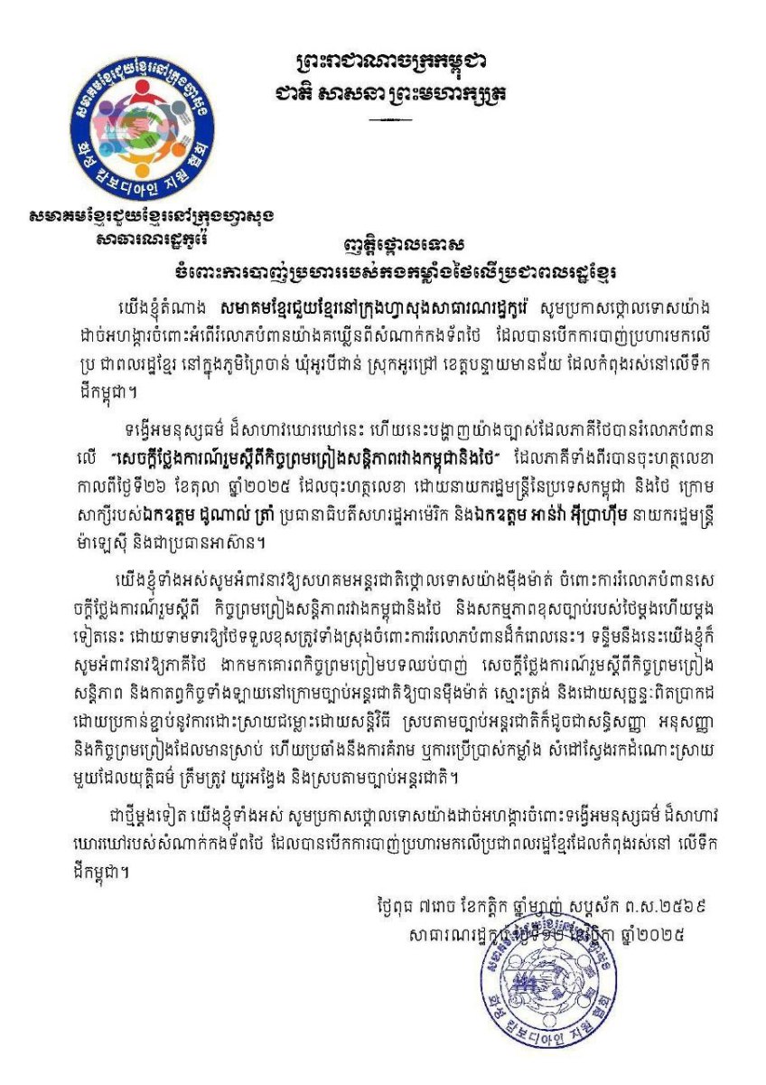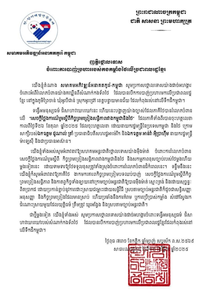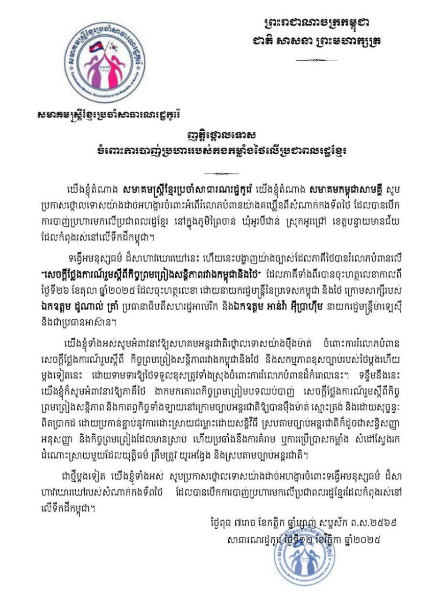 សមាគមខ្មែរចំនួន៦ ដែលមានមូលដ្ឋាននៅប្រទេសកូរ៉េខាងត្បូង នៅថ្ងៃទី១៣ ខែវិច្ឆិកា ឆ្នាំ ២០២៥នេះ បានចេញញត្តិដាច់ដោយឡែកពីគ្នា ដោយថ្កោលទោសយ៉ាងដាច់អហង្ការចំពោះអំពើរំលោភបំពានយ៉ាងគឃ្លើនពីសំណាក់កងទ័ពថៃ ដែលបានបើកការបាញ់ប្រហារមកលើប្រជាពលរដ្ឋខ្មែរ នៅភូមិព្រៃចាន់ ឃុំអូរបីជាន់ ស្រុកអូរជ្រៅ ខេត្តបន្ទាយមានជ័យ ដែលកំពុងរស់នៅលើទឹកដីកម្ពុជា។