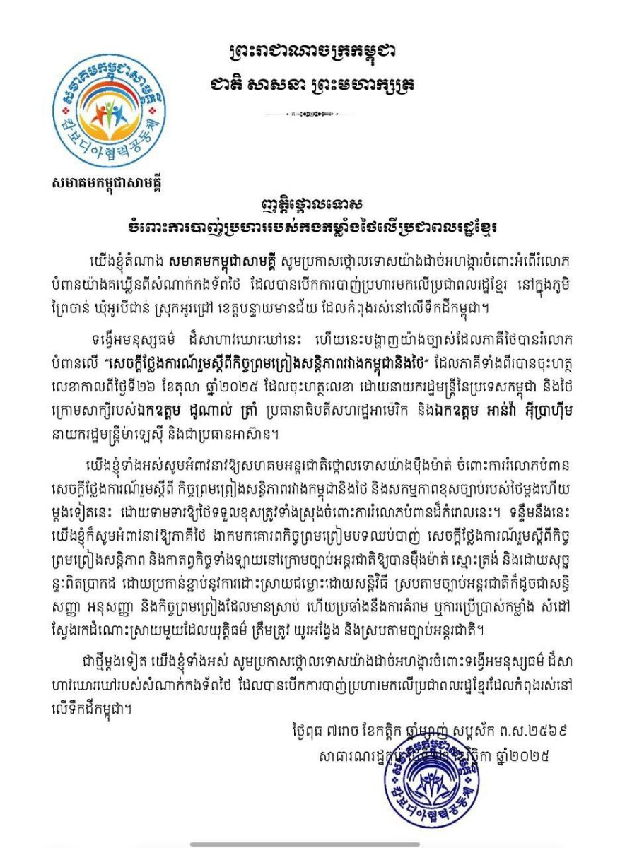 ក្នុងញត្តិថ្កោលទោសសមាគមទាំង៦ បានលើកឡើងពីទង្វើអមនុស្សធម៌ដ៏សាហាវឃោរឃៅរបស់ថៃ ដែលបង្ហាញយ៉ាងច្បាស់ថា ភាគីថៃបានរំលោភបំពានលើ សេចក្តីថ្លែងការណ៍រួមស្តីពីកិច្ចព្រមព្រៀងសន្តិភាពរវាងកម្ពុជានិងថៃ ដែលភាគីទាំងពីរបានចុះហត្ថលេខាកាលពីថ្ងៃទី២៦ ខែតុលា ឆ្នាំ២០២៥ ដោយនាយករដ្ឋមន្ត្រីនៃប្រទេសទាំងពីរដែលមាន ឯកឧត្តម ដូណាល់ ត្រាំ ប្រធានាធិបតីសហរដ្ឋអាមេរិក និង ឯកឧត្តម អាន់វ៉ា អ៊ីប្រាហ៊ីម នាយករដ្ឋមន្ត្រី ម៉ាឡេស៊ី និងជាប្រធានអាស៊ានប្តូរវេនជាសាក្សី។