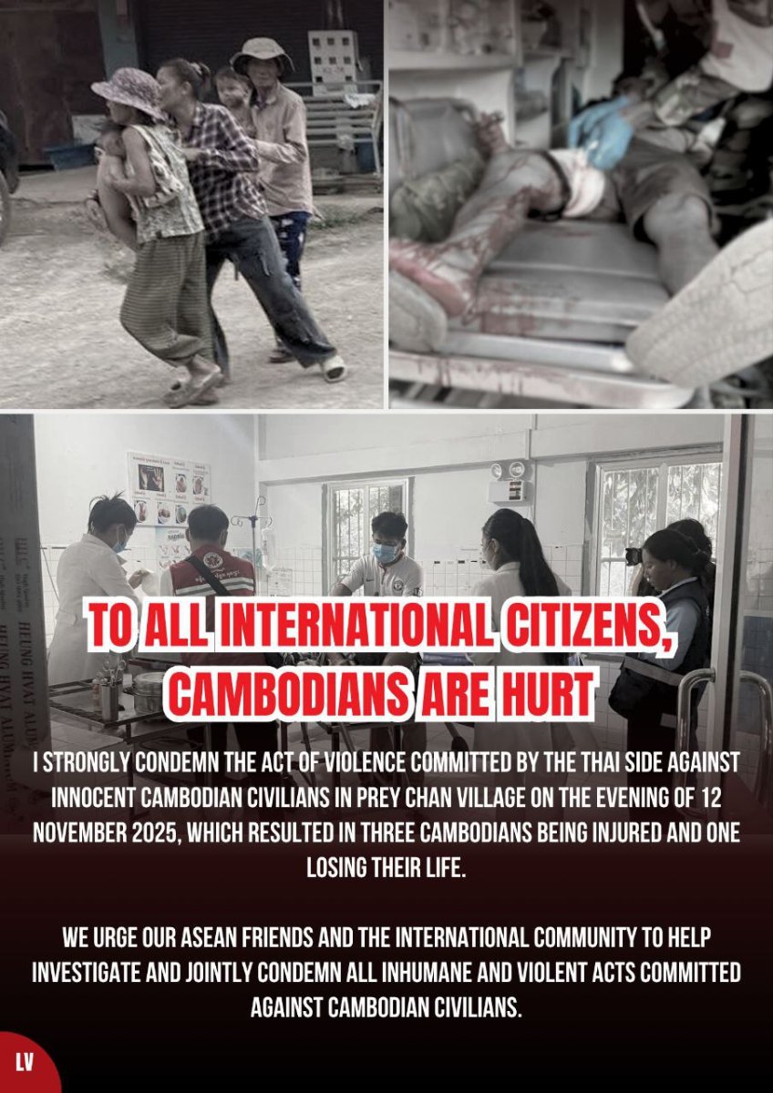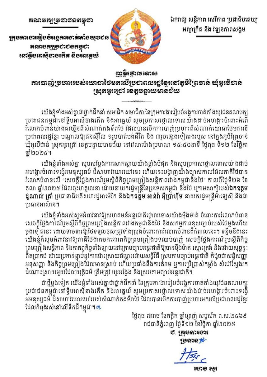 ភ្នំពេញ៖ យុវជនផ្នែករាជធានី ខេត្តនៃយុវជនគណបក្សថ្នាក់កណ្តាល បានចេញញត្តិថ្កោលទោសយ៉ាងដាច់អហង្ការចំពោះអំពើរំលោភបំពានយ៉ាងគឃ្លើនពីសំណាក់កងទ័ពថៃ ដែលបានបើកការបាញ់ប្រហារពីសំណាក់យោធាថៃមកលើ ប្រជាពលរដ្ឋខ្មែរ បណ្តាលឱ្យជនស៊ីវិល ១រូបបាត់បង់ជីវិត និង៣រូបផ្សេងទៀតរងរបួស នៅក្នុងភូមិព្រៃចាន់ ឃុំអូរបីជាន់ ស្រុកអូរជ្រៅ ខេត្តបន្ទាយមានជ័យ កាលពីរសៀលថ្ងៃទី១២ ខែវិច្ឆិកា ឆ្នាំ២០២៥។