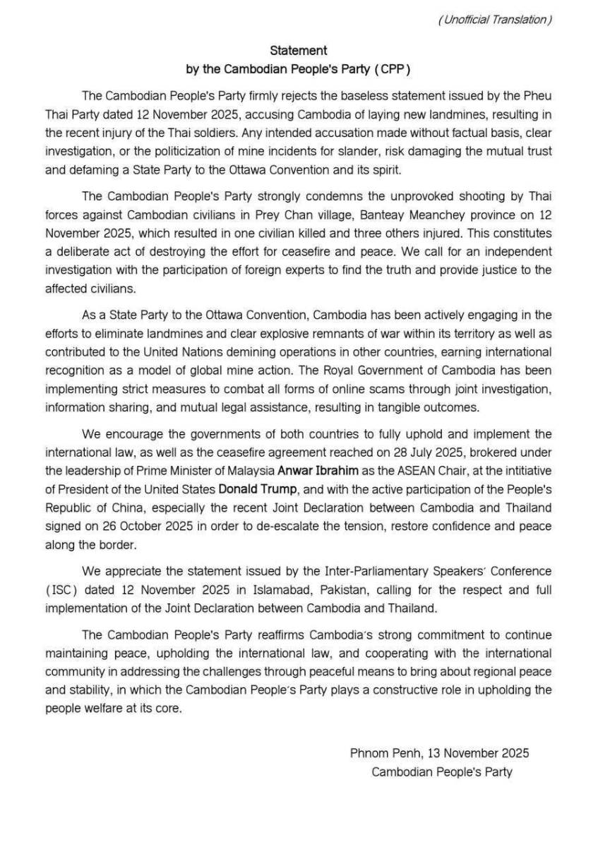 គណបក្សប្រជាជនកម្ពុជា នៅថ្ងៃទី១៣ ខែវិច្ឆិកា ឆ្នាំ២០២៥ នេះ បានចេញ សេចក្តីថ្លែងការណ៍ ច្រានចោលទាំងស្រុងនូវសេចក្តីថ្លែងការណ៍របស់គណបក្សភឿថៃ កាលពីថ្ងៃទី១២ ខែវិច្ឆិកា ឆ្នាំ២០២៥ ដែលបានចោទប្រកាន់កម្ពុជាដោយគ្មានមូលដ្ឋាន ថាបានដាក់មីនថ្មី ដែលបានបណ្ដាល ឱ្យកងទ័ពថៃរបួសកាលពីពេលថ្មីៗនេះ។ ចេតនាចោទប្រកាន់ណាមួយដែលគ្មានការពិត ការស៊ើបអង្កេត ច្បាស់លាស់ ឬការប្រើប្រាស់បញ្ហាផ្ទុះមីន ដើម្បីមួលបង្កាច់នយោបាយអាចនឹងបំផ្លាញដល់ទំនុកចិត្តរវាងគ្នានិងគ្នា ធ្វើឱ្យអាប់ឱនដល់កិត្តិយសរបស់រដ្ឋភាគី និងស្មារតីនៃអនុសញ្ញាអូតាវ៉ា។