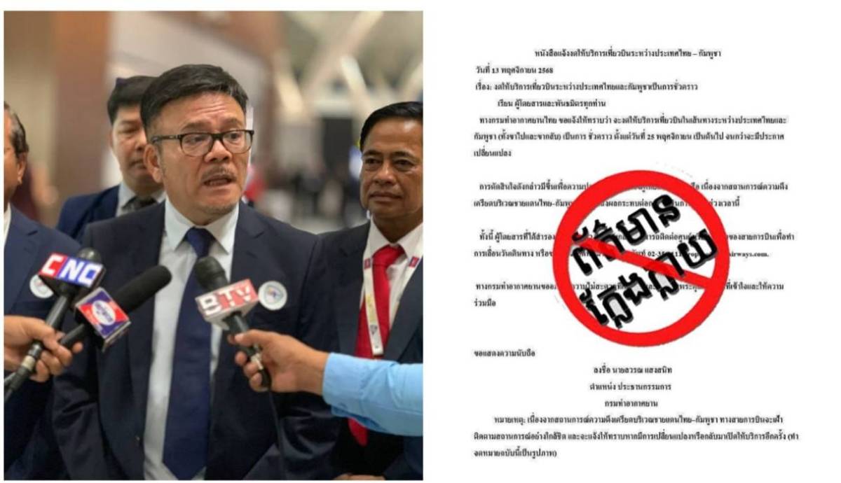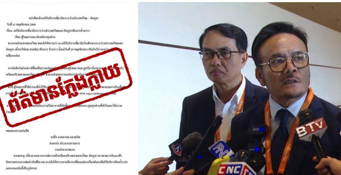 ការចេញមកបញ្ជាក់បែបនេះ របស់អ្នកនាំពាក្យអាកាសចរណ៍ស៊ីវិលបន្ទាប់ពីមានព័ត៌មាន នៅតាមបណ្ដាញសង្គមជាច្រើនផ្សព្វផ្សាយនូវលិខិតជាភាសាថៃមួយ ដែលលើកឡើងថា ថៃបានសម្រេចផ្អាកជើងហោះហើរ ជាមួយកម្ពុជាទាំងស្រុង នៅថ្ងៃទី២៥ ខែវិច្ឆិកា ឆ្នាំ២០២៥ខាងមុខនេះ ប៉ុន្តេលិខិតនេះត្រូវបានអ្នកនាំពាក្យអាកាសចរណ៍ស៊ីវិល អះអាងថាជាលិខិតក្លែងក្លាយ។
