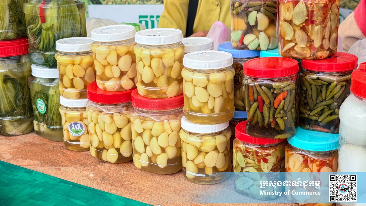 គ្រឿងទេសអាហារកែច្នៃ បន្លែ ផ្លែឈើ ត្រីសាច់ ជាច្រើនមុខជាផលិតនៅក្នុងស្រុកកំពុងដាក់លក់ក្នុងស្តង់ ផ្សារផលិតផលខ្មែរខេត្តតាកែវ