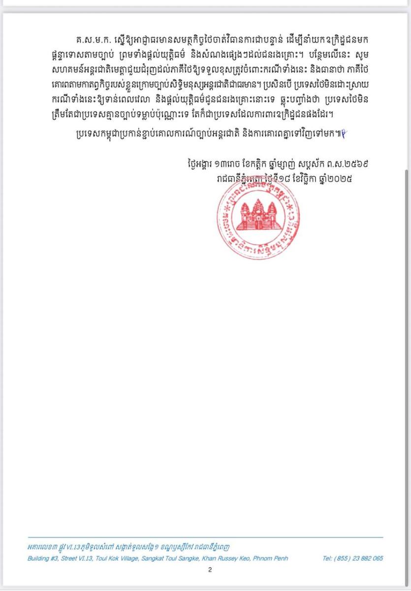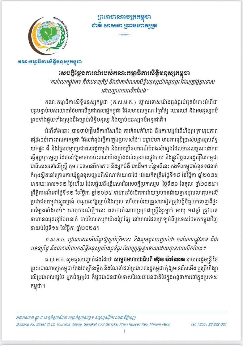 បន្ថែមពីនេះកងទ័ពកម្ពុជាចំនួន១៨នាក់កំពុងស្ថិតនៅក្រោមការឃុំខ្លួនដោយខុសច្បាប់ពីសំណាក់ យោធាថៃ។ ថ្ងៃទី១២ ខែវិច្ឆិកា ទាហានថៃបើការវាយប្រហារដោយគ្មានមូលដ្ឋានមកលើប្រជាជនកម្ពុជា ស្លូតត្រង់ បណ្តាលឲ្យស្លាប់ និងរងរបួស ហើយរាប់រយគ្រួសារទៀតត្រូវបង្ខំចិត្តចាកចេញពីផ្ទះសម្បែងទាំង យប់។ ហេតុការណ៍ថ្មីៗនេះ ពលករចំណាកស្រុកជាស្រ្តីខ្មែរម្នាក់ អាយុ១៨ឆ្នាំ ត្រូវបានទាហានឈុតខ្មៅថៃ ៧នាក់ចាប់រំលោភបូកយ៉ាងព្រៃផ្សៃ នៅពេលដែលត្រឡប់ពីប្រទេសថៃមកកម្ពុជាវិញ នាយប់ថ្ងៃទី១៥ ខែវិច្ឆិកា ឆ្នាំ២០២៥កន្លងទៅនេះ។ គ.ស.ម.ក. «សូមថ្កោលអំពើគួរឲ្យស្អប់ខ្ពើមនេះ និងសូំគូសបញ្ជាក់ថាការផ្លូវភេទ គឺជាបទឧក្រិដ្ឋ និងជាការរំលោភសិទ្ធិមនុស្សយ៉ាងធ្ងន់ធ្ងរ ដែលត្រូវផ្តន្ទាទោសដោយគ្មានការលើកលែង»៕ អត្ថបទបាន ចក់