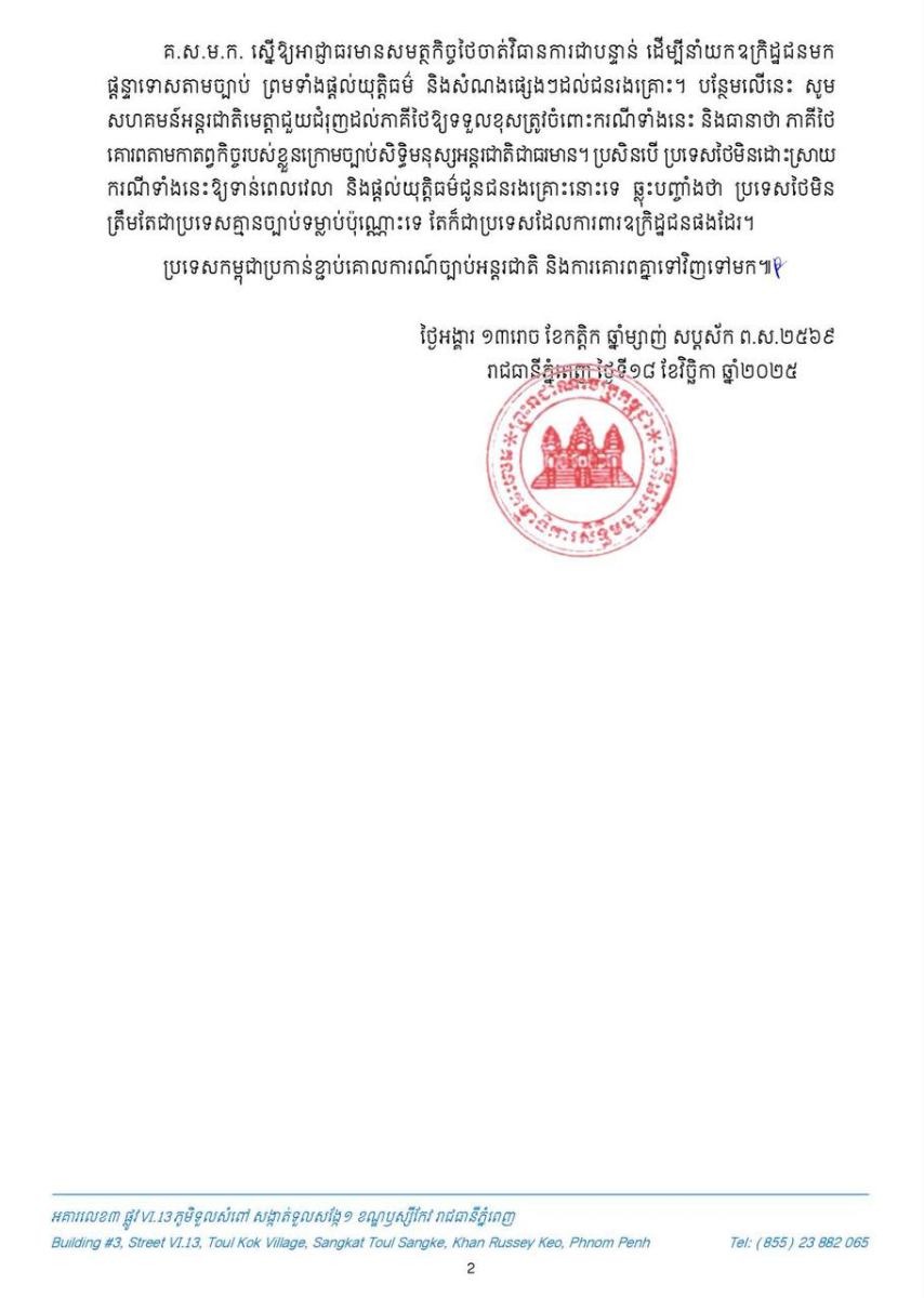 គ.ស.ម.ក. ស្នើឱ្យអាជ្ញាធរមានសមត្ថកិច្ចថៃចាត់វិធានការជាបន្ទាន់ ដើម្បីនាំយកឧក្រិដ្ឋជនមក ផ្តន្ទាទោសតាមច្បាប់ ព្រមទាំងផ្តល់យុត្តិធម៌ និងសំណងផ្សេងៗដល់ជនរងគ្រោះ។ បន្ថែមលើនេះ សូម សហគមន៍អន្តរជាតិមេត្តាជួយជំរុញដល់ភាគីថៃឱ្យទទួលខុសត្រូវចំពោះករណីទាំងនេះ និងធានាថា ភាគីថៃ គោរពតាមកាតព្វកិច្ចរបស់ខ្លួនក្រោមច្បាប់សិទ្ធិមនុស្សអន្តរជាតិជាធរមាន។ ប្រសិនបើ ប្រទេសថៃមិនដោះស្រាយ ករណីទាំងនេះឱ្យទាន់ពេលវេលា និងផ្តល់យុត្តិធម៌ជូនជនរងគ្រោះនោះទេ ឆ្លុះបញ្ចាំងថា ប្រទេសថៃមិន ត្រឹមតែជាប្រទេសគ្មានច្បាប់ទម្លាប់ប៉ុណ្ណោះទេ តែក៏ជាប្រទេសដែលការពារឧក្រិដ្ឋជនផងដែរ។ គ.ស.ម.ក. បញ្ជាក់ថា ប្រទេសកម្ពុជាប្រកាន់ខ្ជាប់គោលការណ៍ច្បាប់អន្តរជាតិ និងការគោរពគ្នាទៅវិញទៅមក៕