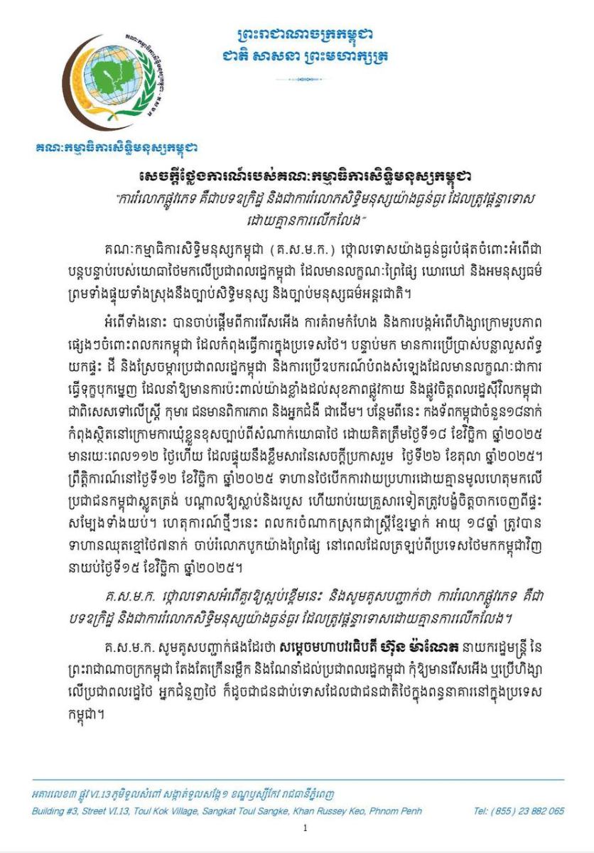 គណៈកម្មាធិការសិទ្ធិមនុស្សកម្ពុជា (គ.ស.ម.ក.) ចាត់ទុកអំពើទាំងនោះ បានចាប់ផ្តើមពីការរើសអើង ការគំរាមកំហែង និងការបង្កអំពើហិង្សាក្រោមរូបភាព ផ្សេងៗចំពោះពលករកម្ពុជា ដែលកំពុងធ្វើការក្នុងប្រទេសថៃ។ បន្ទាប់មក មានការប្រើប្រាស់បន្លាលួសព័ទ្ធ យកផ្ទះ ដី និងស្រែចម្ការប្រជាពលរដ្ឋកម្ពុជា និងការប្រើឧបករណ៍បំពងសំឡេងដែលមានលក្ខណៈជាការ ធ្វើទុក្ខបុកម្នេញ ដែលនាំឱ្យមានការប៉ះពាល់យ៉ាងខ្លាំងដល់សុខភាពផ្លូវកាយ និងផ្លូវចិត្តពលរដ្ឋស៊ីវិលកម្ពុជា ជាពិសេសទៅលើស្ត្រី កុមារ ជនមានពិការភាព និងអ្នកជំងឺ ជាដើម។ បន្ថែមពីនេះកងទ័ពកម្ពុជាចំនួន១៨នាក់ កំពុងស្ថិតនៅក្រោមការឃុំខ្លួនខុសច្បាប់ពីសំណាក់យោធាថៃ ដោយគិតត្រឹមថ្ងៃទី១៨ ខែវិច្ឆិកា ឆ្នាំ២០២៥ មានរយៈពេល១១២ ថ្ងៃហើយ ដែលផ្ទុយនឹងខ្លឹមសារនៃសេចក្តីប្រកាសរួម ថ្ងៃទី២៦ ខែតុលា ឆ្នាំ២០២៥។ ព្រឹត្តិការណ៍នៅថ្ងៃទី១២ ខែវិច្ឆិកា ឆ្នាំ២០២៥ ទាហានថៃបើកការវាយប្រហារដោយគ្មានមូលហេតុមកលើ ប្រជាជនកម្ពុជាស្លូតត្រង់ បណ្តាលឱ្យស្លាប់និងរបួស ហើយរាប់រយគ្រួសារទៀតត្រូវបង្ខំចិត្តចាកចេញពីផ្ទះ សម្បែងទាំងយប់។