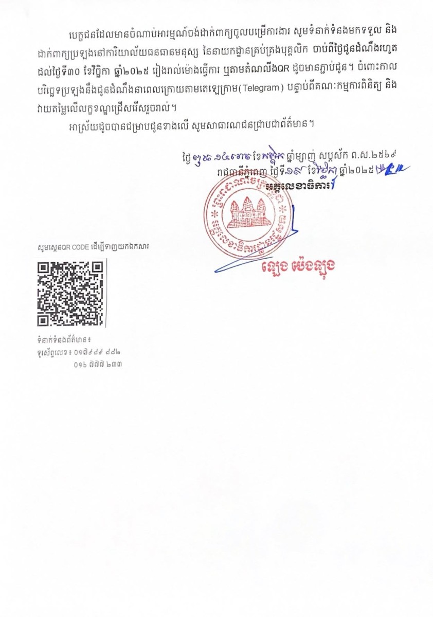 បេក្ខជនដែលមានចំណាប់អារម្មណ៍ចង់ដាក់ពាក្យចូលបម្រើការងារ សូមទំនាក់ទំនងមកទទួល និងដាក់ពាក្យប្រឡងនៅការិយាល័យធនធានមនុស្ស នៃនាយកដ្ឋានគ្រប់គ្រងបុគ្គលិក នៃអគ្គលេខាធិការដ្ឋានរដ្ឋសភា ចាប់ពីថ្ងៃជូនដំណឹងរហូតដល់ ថ្ងៃទី៣០ ខែវិច្ឆិកា ឆ្នាំ២០២៥ រៀងរាល់ម៉ោងធ្វើការ ឬតាមតំណលីងQR ដូចមានភ្ជាប់ជូន។