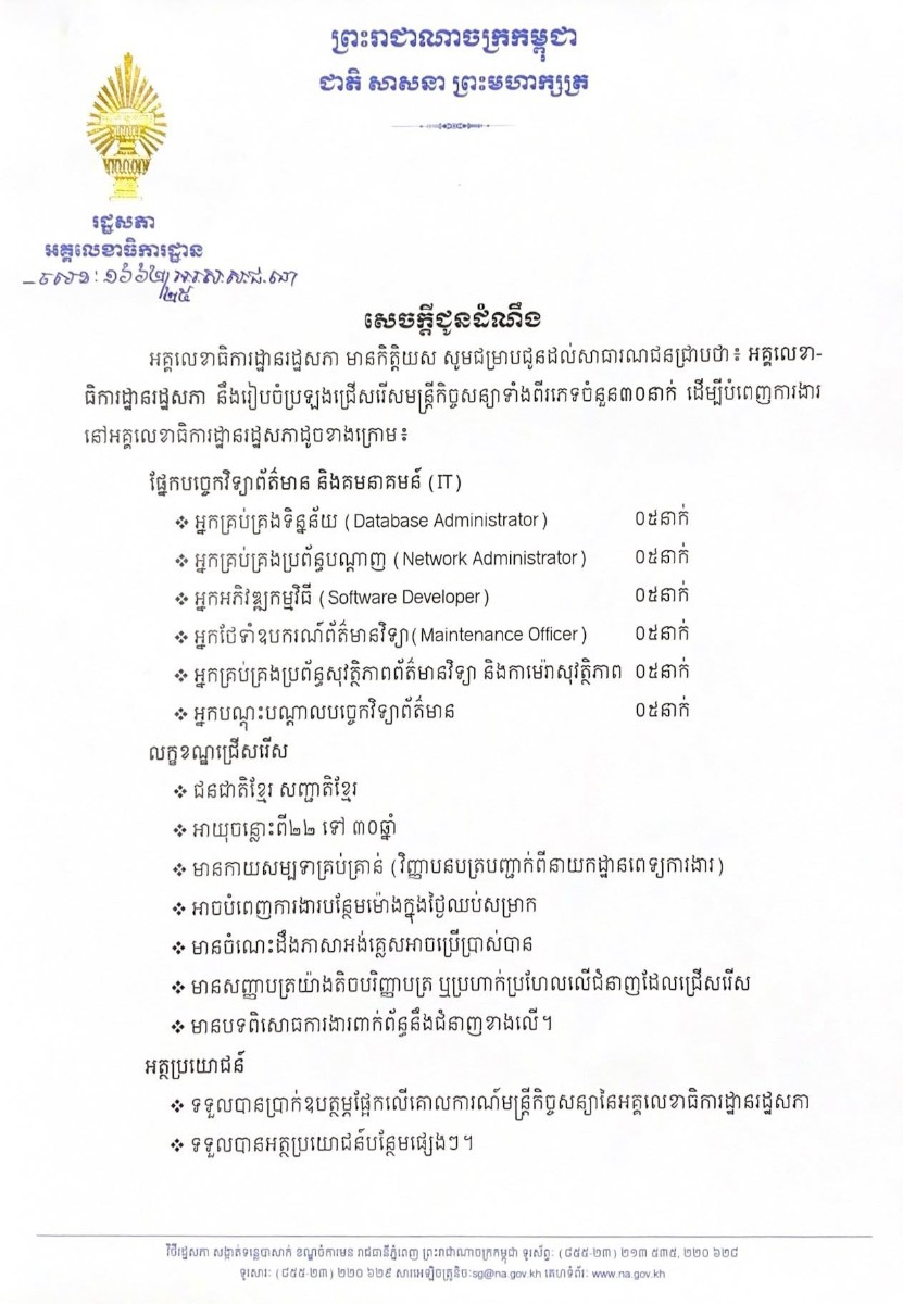 អគ្គលេខាធិការដ្ឋានរដ្ឋសភា នៅថ្ងៃទី១៩ ខែវិច្ឆិកា ឆ្នាំ២០២៥ នេះ បានចេញសេចក្តីជូនដំណឹងដល់សាធារណជនជ្រាបថា អគ្គលេខាធិការដ្ឋានរដ្ឋសភា នឹងរៀបចំប្រឡងជ្រើសរើសមន្ត្រីកិច្ចសន្យាទាំងពីរភេទចំនួន ៣០នាក់ ដើម្បីបំពេញការងារ នៅអគ្គលេខាធិការដ្ឋានរដ្ឋសភា ផ្នែកបច្ចេកវិទ្យាព័ត៌មាន និងគមនាគមន៍ (IT)។