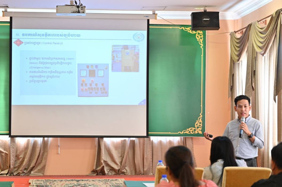 លោក កូវ ប៊ុនធឿន អនុប្រធាននាយកដ្ឋាន តំណាងប្រធាននាយកដ្ឋានពេទ្យការងារនៃក្រសួងការងារ និងបណ្ដុះបណ្ដាលវិជ្ជាជីវៈ បានដឹកនាំក្រុមការងារចូលរួម និងធ្វើបទបង្ហាញ ដើម្បីការផ្សព្វផ្សាយ ណែនាំ និងបង្កើនការយល់ដឹងដល់សហគ្រាស រោងចក្រ ក្រុមហ៊ុន ស្ដីពីច្បាប់ បទដ្ឋានគតិយុត្ត និងគោលការណ៍ណែនាំដែលពាក់ព័ន្ធនឹងសុវត្ថិភាព និងសុខភាពការងារនៅកន្លែងធ្វើការ។