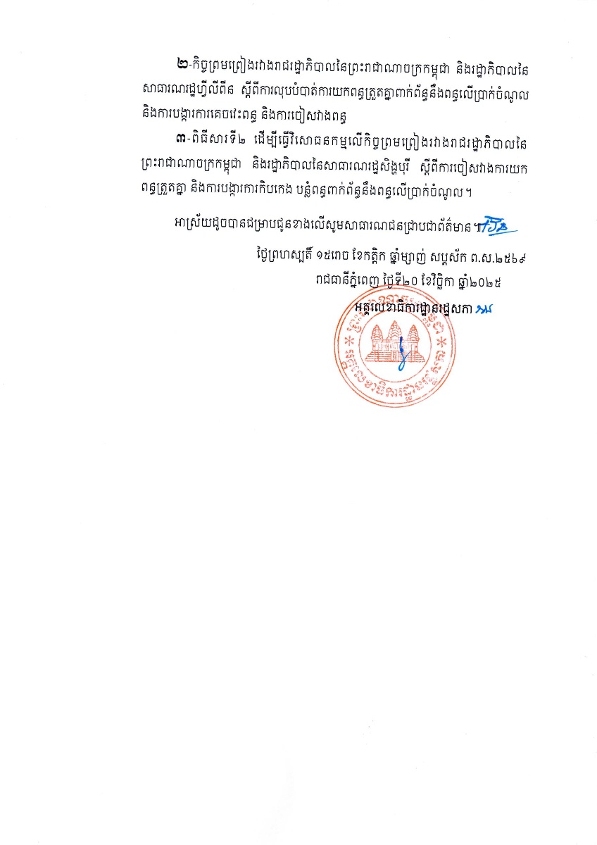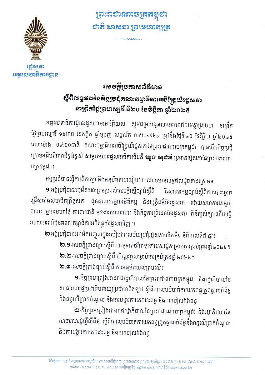 នាព្រឹក ថៃ្ងព្រហស្បតិ៍ ទី២០ ខែវិច្ឆិកា ឆ្នាំ២០២៥ នេះ គណៈកម្មាធិការអចិន្ត្រៃយ៍រដ្ឋសភា នៃព្រះរាជាណាចក្រកម្ពុជា បានបើកកិច្ចប្រជុំ ក្រោមអធិបតីភាពដ៏ខ្ពង់ខ្ពស់ សម្តេចមហារដ្ឋសភាធិការធិបតី ឃួន សុដារី ប្រធានរដ្ឋសភានៃព្រះរាជាណាចក្រកម្ពុជា។