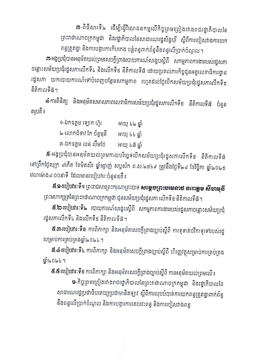 ៥. អង្គប្រជុំបានអនុម័តយល់ព្រមកាលបរិច្ឆេទបើកសម័យប្រជុំរដ្ឋសភាលើកទី៥ នីតិកាលទី៧ នៅព្រឹកថ្ងៃសុក្រ ទី២៨ ខែវិច្ឆិកា ឆ្នាំ២០២៥ វេលាម៉ោង៨:០០នាទី ដែលមានរបៀបវារៈចំនួន៥។