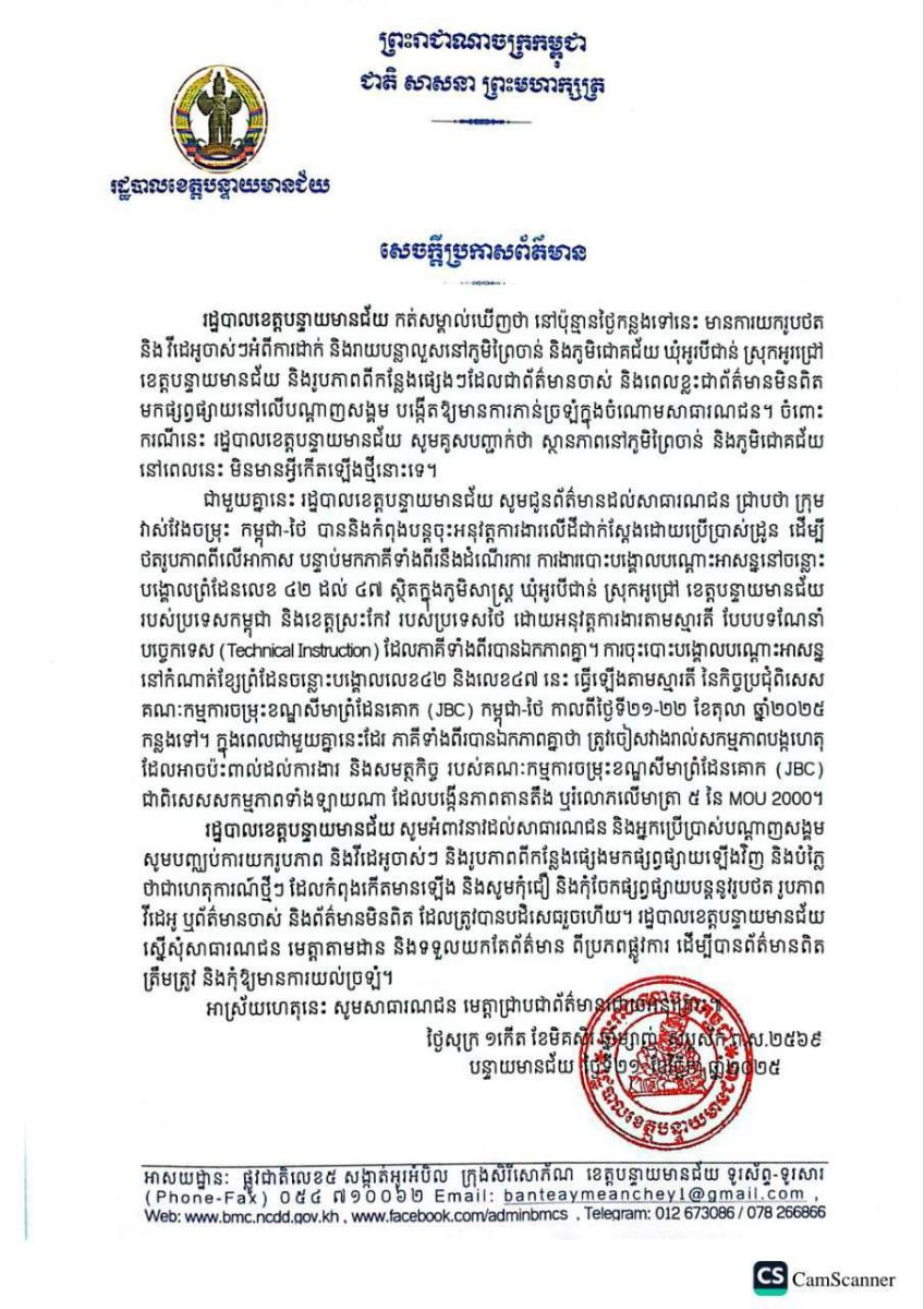 រដ្ឋបាលខេត្តបន្ទាយមានជ័យ កត់សម្គាល់ឃើញថា នៅប៉ុន្មានថ្ងៃកន្លងទៅនេះ មានការយករូបថត និងវីដេអូចាស់ៗអំពីការដាក់ និងរាយបន្លាលួសនៅភូមិព្រៃចាន់ និងភូមិជោគជ័យ ឃុំអូរបីជាន់ ស្រុកអូរជ្រៅ ខេត្តបន្ទាយមានជ័យ និងរូបភាពពីកន្លែងផ្សេងៗដែលជាព័ត៌មានចាស់ និងពេលខ្លះជាព័ត៌មានមិនពិត មកផ្សព្វផ្សាយនៅលើបណ្តាញសង្គម បង្កើតឱ្យមានការភាន់ច្រឡំក្នុងចំណោមសាធារណជន។ ចំពោះករណីនេះ រដ្ឋបាលខេត្តបន្ទាយមានជ័យ សូមគូសបញ្ជាក់ថា ស្ថានភាពនៅភូមិព្រៃចាន់ និងភូមិជោគជ័យ នៅពេលនេះ មិនមានអ្វីកើតឡើងថ្មីនោះទេ។