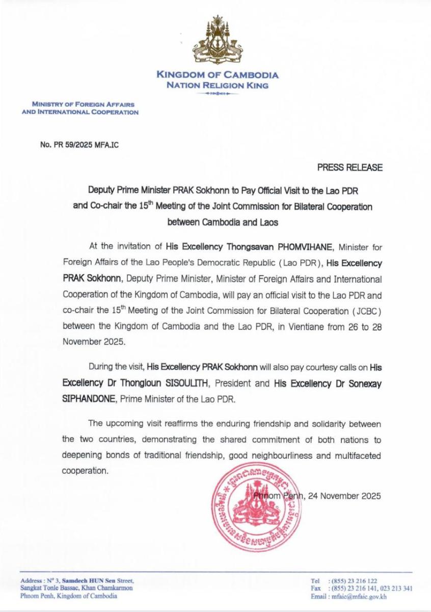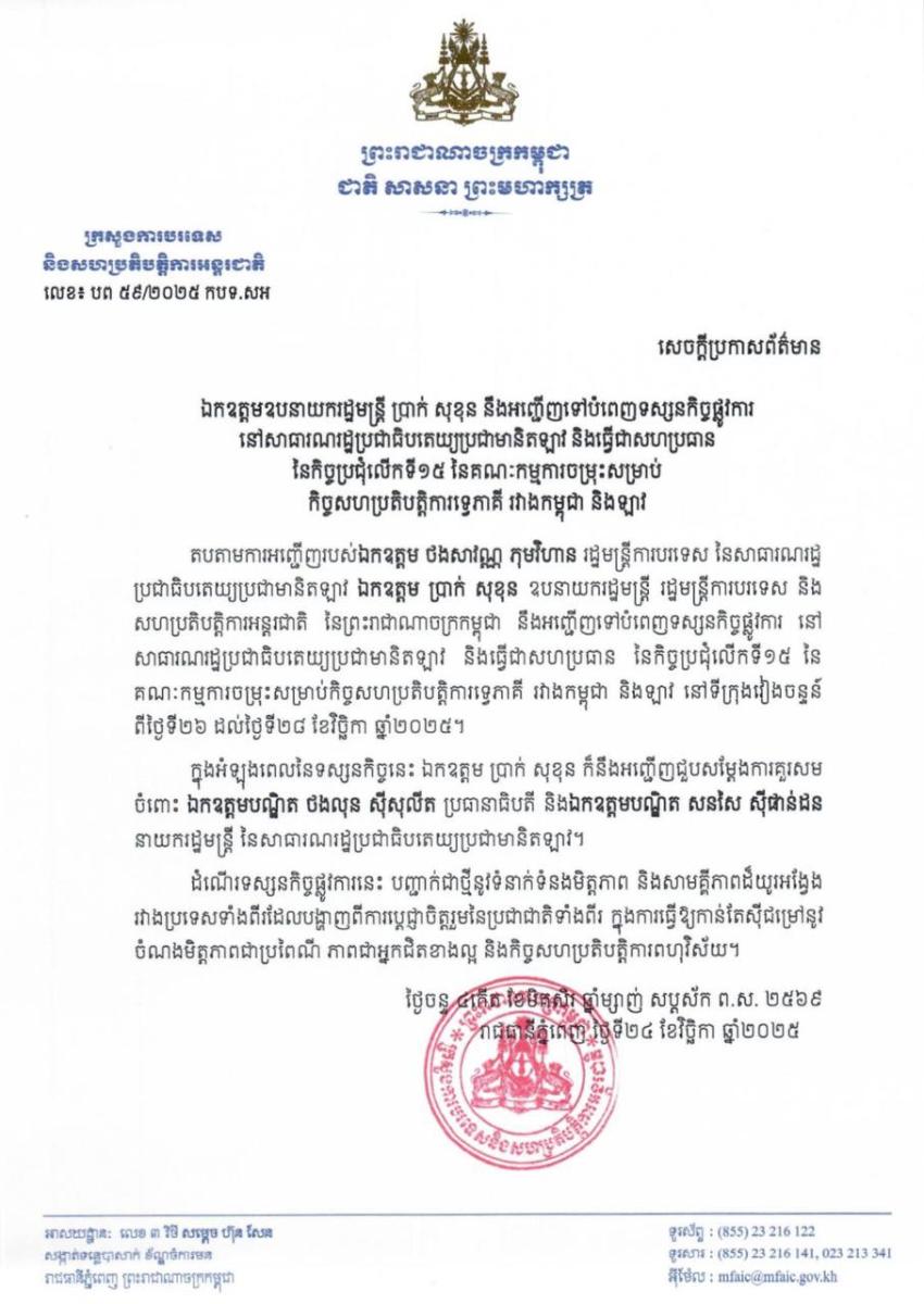តបតាមការអញ្ជើញរបស់ឯកឧត្តម ថងសាវណ្ណ ភុមវិហាន រដ្ឋមន្ត្រីការបរទេស នៃសាធារណរដ្ឋ ប្រជាធិបតេយ្យប្រជាមានិតឡាវ ឯកឧត្តម ប្រាក់ សុខុន ឧបនាយករដ្ឋមន្ត្រី រដ្ឋមន្ត្រីការបរទេស និងសហប្រតិបត្តិការអន្តរជាតិ នៃព្រះរាជាណាចក្រកម្ពុជា នឹងអញ្ជើញទៅបំពេញទស្សនកិច្ចផ្លូវការនៅសាធារណរដ្ឋប្រជាធិបតេយ្យប្រជាមានិតឡាវ និងធ្វើជាសហប្រធាន នៃកិច្ចប្រជុំលើកទី១៥ នៃគណៈកម្មការចម្រុះសម្រាប់កិច្ចសហប្រតិបត្តិការទ្វេភាគីរវាងកម្ពុជា និងឡាវ នៅទីក្រុងវៀងចន្ទន៍ ពីថ្ងៃទី២៦ ដល់ថ្ងៃទី២៨ ខែវិច្ឆិកា ឆ្នាំ២០២៥។