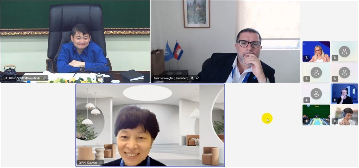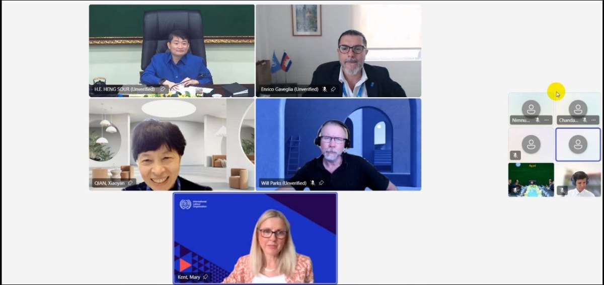 ឯកឧត្តម ហេង សួរ រដ្ឋមន្ត្រីក្រសួងការងារ និងបណ្តុះបណ្តាលវិជ្ជាជីវៈ បានទទួលជួបពិភាក្សាការងារជាមួយ លោកស្រី Xiaoyan Qian នាយិកាការិយាល័យអង្គការអន្តរជាតិខាងការងារ (ILO) ប្រចាំប្រទេសថៃ កម្ពុជា និងឡាវ និងតំណាងទីភ្នាក់ងារអង្គការសហប្រជាជាតិ តាមប្រព័ន្ធអនឡាញ នារសៀលថ្ងៃទី២៤ ខែវិច្ឆិកា ឆ្នាំ២០២៥ ដើម្បីពិភាក្សាស្វែងយល់អំពីវឌ្ឍនភាព និងទិសដៅសម្រាប់ការអនុវត្តផែនទីបង្ហាញផ្លូវរបស់កម្ពុជាសម្រាប់កាតាលិករសកល ស្តីពី ការងារសមរម្យ និងការគាំពារសង្គមសម្រាប់អន្តរកាលយុត្តិធម៌ (ក.ផ.ក.អ.)។