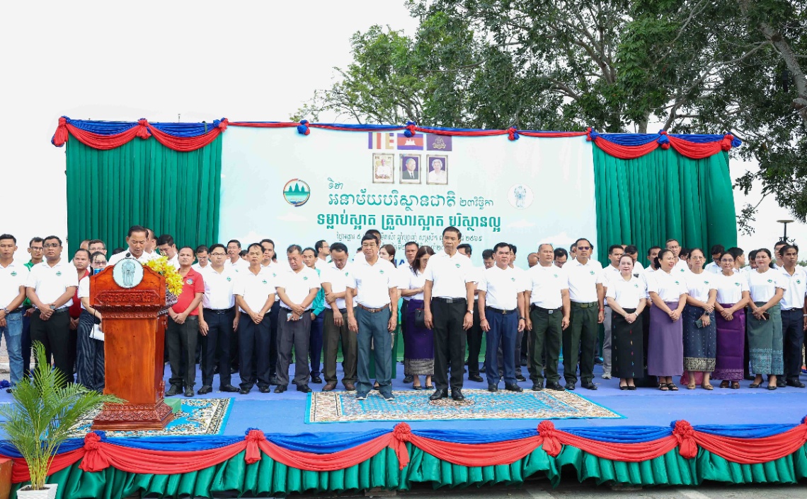 ថ្លែងទៅកាន់អង្គពិធី ឯកឧត្តម អ៊ាត សីលា រដ្ឋលេខាធិការ បានគូសបញ្ជាក់ថា ទិវានាថ្ងៃនេះ មិនមែនគ្រាន់តែជាពិធីជួបជុំ ដើម្បីនាំគ្នាសម្អាតអនាម័យបរិស្ថានតែមួយថ្ងៃ ហើយបញ្ចប់ទៅនោះឡើយ ប៉ុន្តែគឺជាទិវាជួបជុំមួយដែលអាចចាត់ទុកបានថា ជាការកំណត់នូវប្រវត្តិសាស្រ្តរួមគ្នាថ្មីមួយទៀត ដោយធ្វើការរំលឹក និងពង្រឹងស្មារតី របស់យើងទាំងអស់គ្នា អំពីតួនាទីដ៏សំខាន់របស់បរិស្ថានស្អាត ក្នុងការកសាងសង្គមកម្ពុជា ជាសង្គមមួយ មានសុខភាពល្អ មានសេចក្តីថ្លៃថ្នូរ និងមានការអភិវឌ្ឍប្រកបដោយចីរភាព ក្រោមការដឹកនាំប្រកបដោយគតិបណ្ឌិតរបស់ សម្តេចមហាបវរធិបតី ហ៊ុន ម៉ាណែត នាយករដ្ឋមន្ត្រីនៃព្រះរាជាណាចក្រកម្ពុជា ដែលបានដាក់ចេញនូវ យុទ្ធសាស្ត្របញ្ចកោណ ដំណាក់កាលទី១ សំដៅកសាងមូលដ្ឋានគ្រឹះដ៏រឹងមាំ ដើម្បីកសាងសង្គមកម្ពុជាជាប្រទេសដែលមានបរិស្ថាន រូបវន្ត និងធម្មជាតិប្រកបដោយសុខដុមភាព ភាពធន់ បរិយាបន្ន និងតុល្យភាពរវាងការអភិវឌ្ឍ និងការអភិរក្សធនធានធម្មជាតិ សម្រាប់ការរស់នៅប្រកបដោយផាសុកភាព ដោយផ្តោតសំខាន់ចំពោះសន្តិសុខថាមពល ការរៀបចំប្រព័ន្ធគ្រប់គ្រងកាកសំណល់ ប្រកបដោយប្រសិទ្ធភាព ការកសាងប្រព័ន្ធបន្ស៊ាំ រឹងម៉ាំទៅនឹងការប្រែប្រួលអាកាសធាតុ ប្រែក្លាយកម្ពុជាជាប្រទេសចំណូលខ្ពស់ និងជាប្រទេសដែលមានអព្យាក្រឹតភាពកាបូននៅឆ្នាំ ២០៥០។